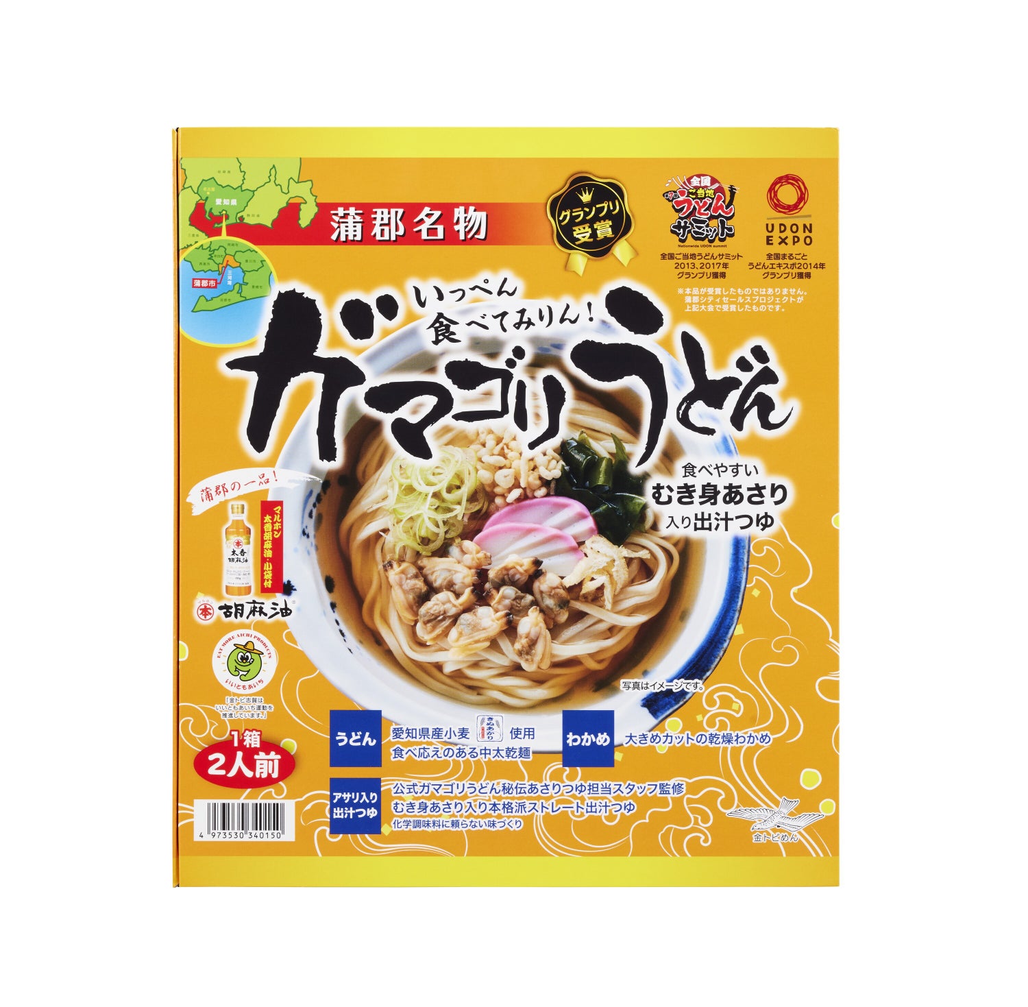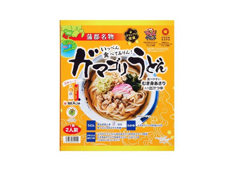 うどんの全国大会で3冠グランプリを受賞した蒲郡のご当地グルメ「ガマゴリうどん」。この味をご家庭で簡単に楽しめるご当地めんセットとして「ガマゴリうどん ギフトセット」を販売。2014年に販売を開始し、2020年に国産アサリの不漁等で一時終売となったものの、翌年2021年のリニューアルを機に、よりグランプリの味わいに近づけたお土産ギフトセットとして復活を果たしました。㈱金トビ志賀のこだわりでもある小麦から製粉、製麺を一貫しておこなう製法で作った愛知県産小麦「きぬあかり」の角切り中太乾めんは食べ応え抜群。むき身あさり入りのあさりダシつゆは、大会のつゆ担当スタッフ監修のもと作り上げた秘伝のつゆです。大切りワカメと、蒲郡の一品として竹本油脂製の太香胡麻油を詰合せ、本場同様に胡麻油をチョイ足しして味の変化をお楽しみいただける商品となっております。