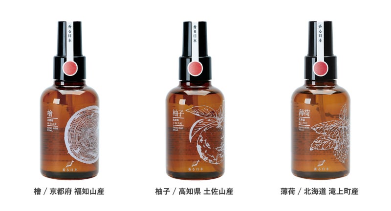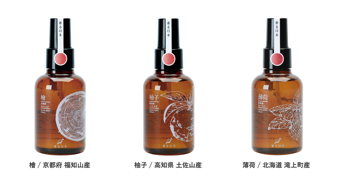 日本各地で育った植物から抽出した精油を使って作ったルームミスト。生活するリビングや寝室に香らせるアイテムとして、生産者の方々や各地域から、誰からも愛されるような爽やかな香り立ちの精油を戴きました。消臭成分配合。