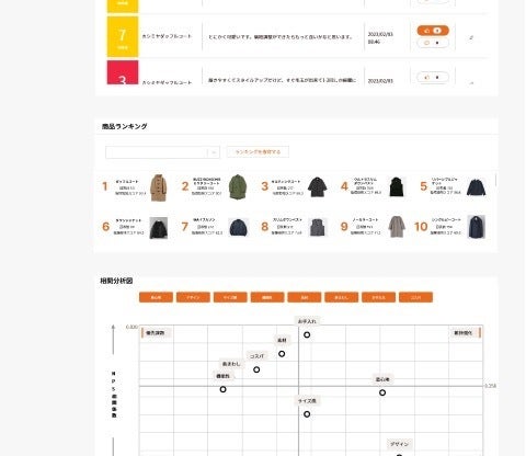 シーズンごとに、新商品を開発しなければいけない状況の中、トレンドをおさえつつ、顧客の声を商品ごとに集計し、顧客の「快」に焦点を当てることで「売れ続ける商品」を作るためのVOC収集・分析サービスです。