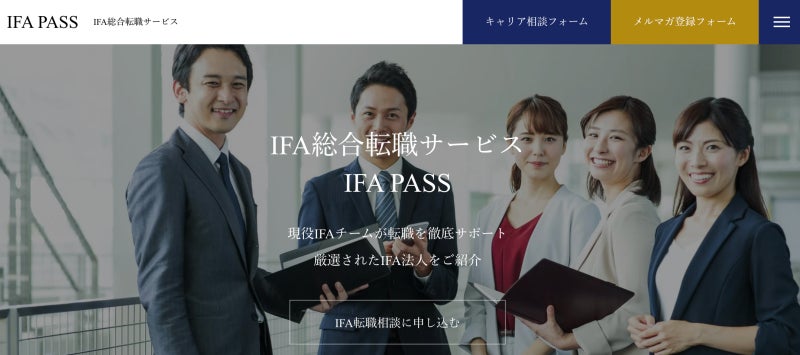 IFA総合転職サービス。現役IFAチームがキャリアアドバイザーを務める。バック率、サポート体制などが充実している業界トップクラスの優良法人のみと提携。