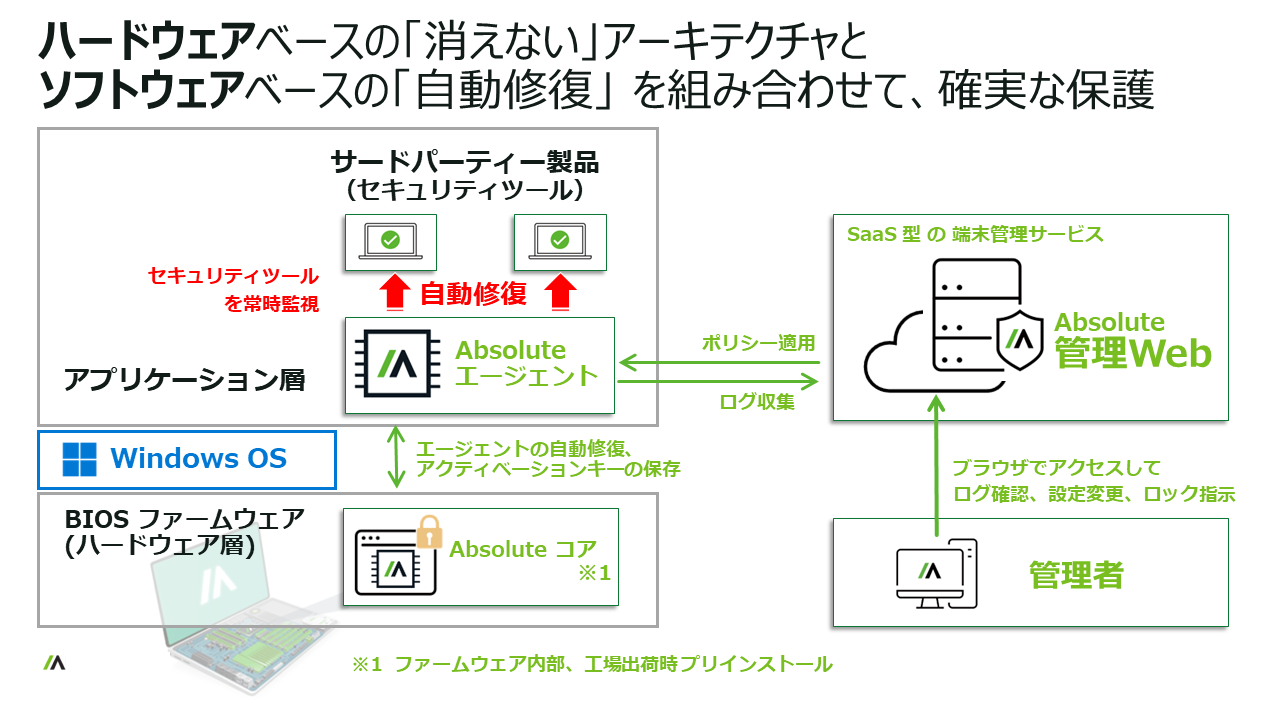エンドポイント管理の機能で、IT資産の可視化、情報漏洩の阻止、導入したセキュリティ機能の確実な実行、セキュリティアプリやビジネスアプリが壊れたり削除されたりしたときに自動復活させて、組織の安全を守ります。