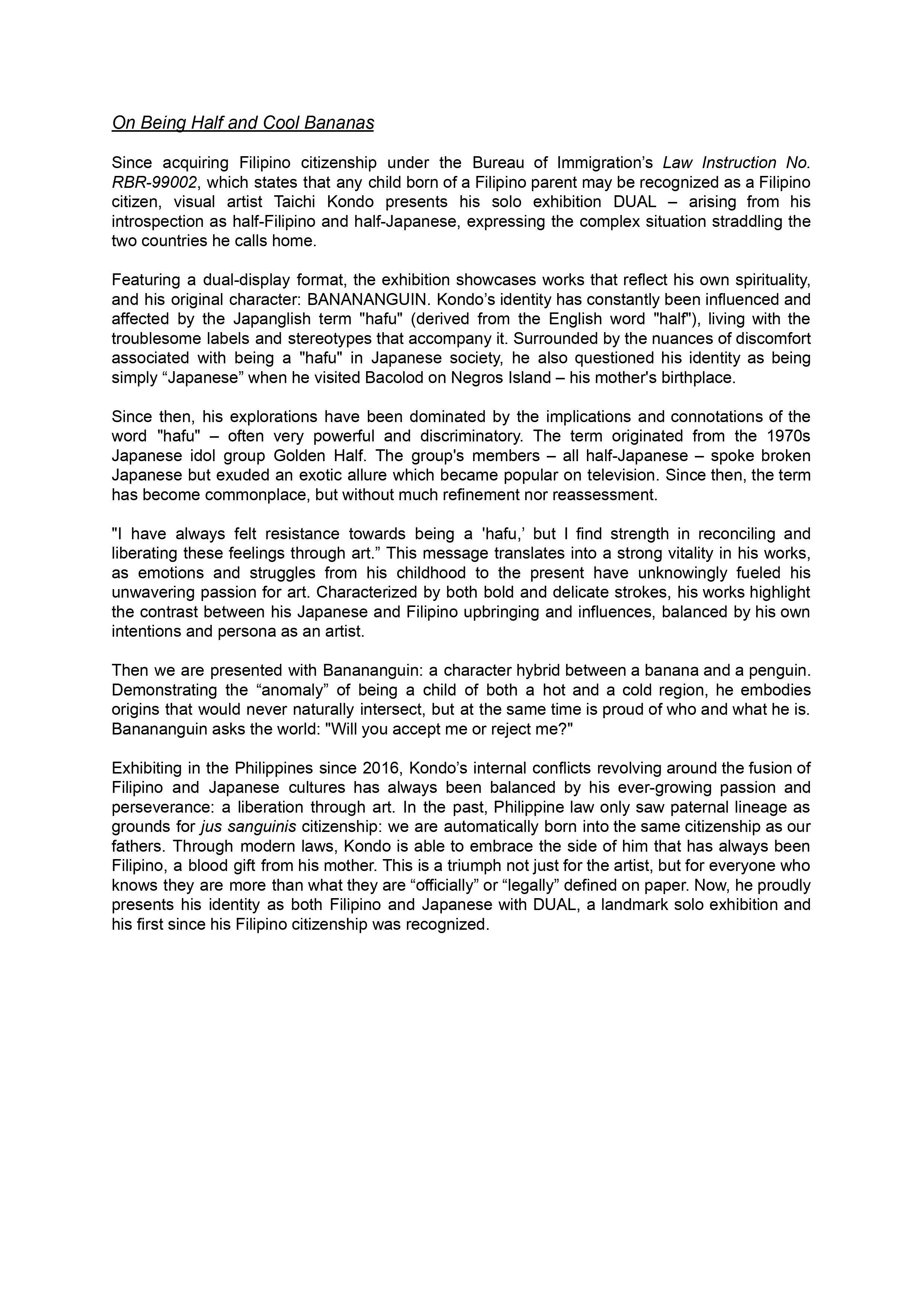 テーマ「DUAL」は、フィリピンと日本という二つの国にまたがる近藤自身のアイデンティティの内観から生みだされた。