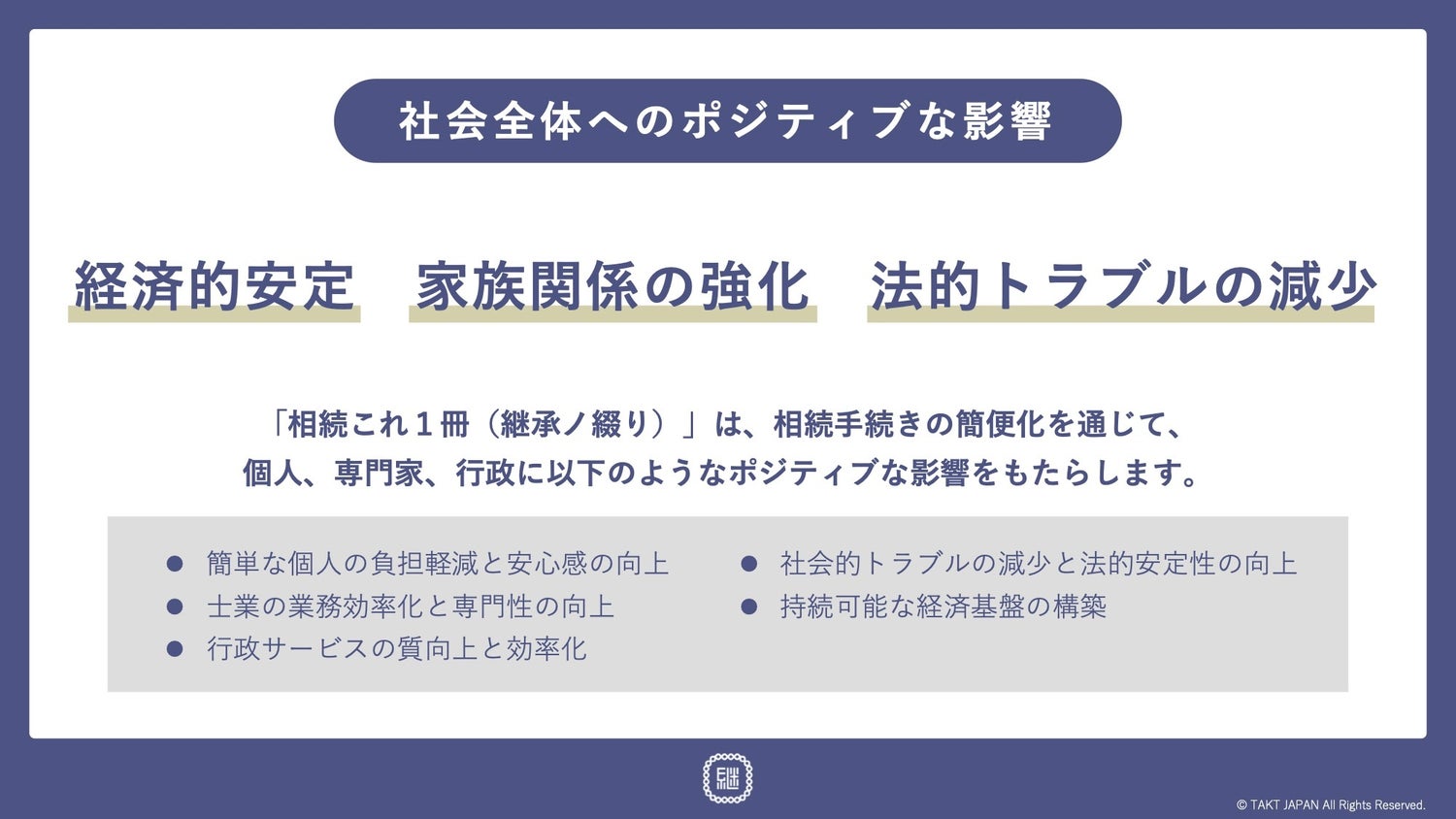 私たちが目指しているのは、社会全体で相続というライフイベントが円滑に完結する循環を生むために、相続手続きが簡単で身近になり、誰もが一定の知識で解決できる時代にしたいです。それは、高齢化社会で求められる持続可能な仕組みづくりの一例となりえると考えております。「相続これ1冊(継承ノ綴り)」は、個人の負担軽減だけでなく、行政の窓口負荷軽減や士業による高度案件対応の促進も更に可能となり、可視化された内容のため、家族間トラブル防止や皆様が年間相続手続きに使用したと思われる長い時間を有効に活用できる可能性さえあるといった、社会全体にプラスをもたらす可能性があると考えております。