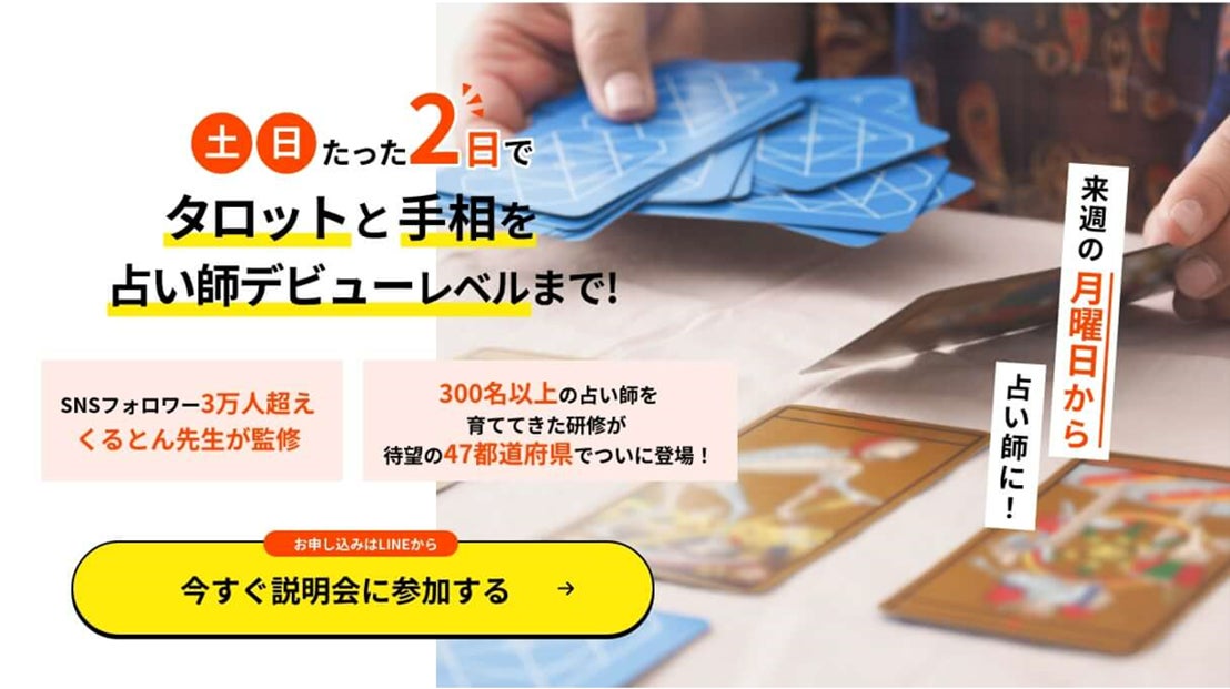 全国47都道府県で開催中の占いスクール・教室!タロットと手相の集中講座。現役の有名人気占い師が直接指導。たった2日間でプロ占い師の鑑定スキルが身に着く占い師養成講座。タロット&手相鑑定士のW資格取得可能。初めて占いを学ぶ初心者、大歓迎。入会金・月額料金なし。