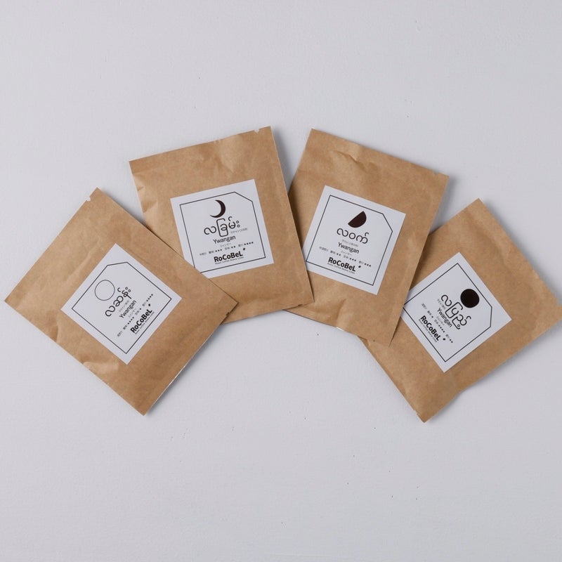 ユワンガンのAmayar Women's Coffee Groupからフェアトレードで購入したスペシャリティ・コーヒー豆を浅煎り・中煎り・中深煎り・深煎りの4段階に焙煎。それぞれを月の満ち欠けに見立てて表現。RoCoBeLの定番商品の飲み比べセット。