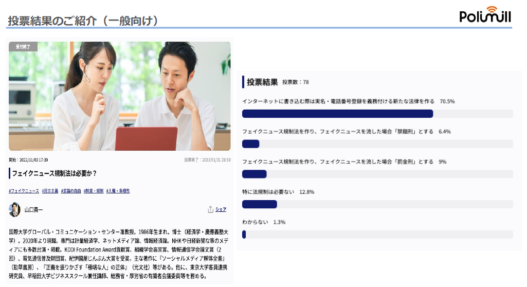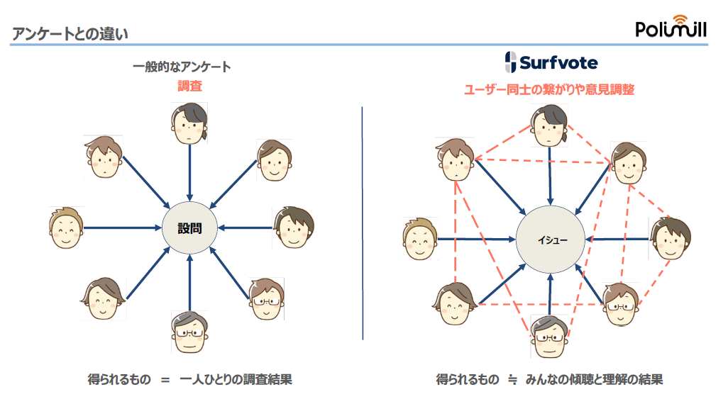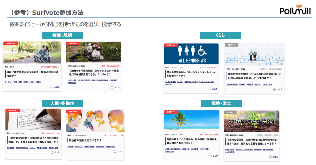 Polimill株式会社が提供するSNS「Surfvote」は、社会にあるさまざまな課題を問題提起し、それについて誰もが簡単に意見を投票できるサービスです。Surfvoteでは「イシュー」と呼ばれる各テーマ(課題)に対して複数の選択肢から自分の意見を投票できます。また他のユーザーのコメントを見たり、評価(いいね)したりすることもできます。イシューは当社編集部だけでなく大学の先生やさまざまな分野の専門家にも執筆のご協力をいただき発行しています。投票結果はイシューの内容に応じて、適宜関係省庁や政治家へ提出し報告を行なっています。各イシューで投票・コメントしていただいた1人1人の意見を大切に扱い、社会を前進させるために寄与したいと考えています。https://surfvote.com/
