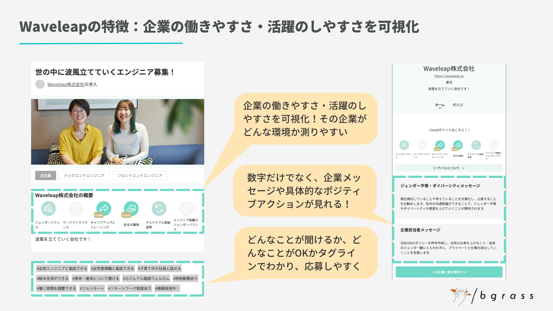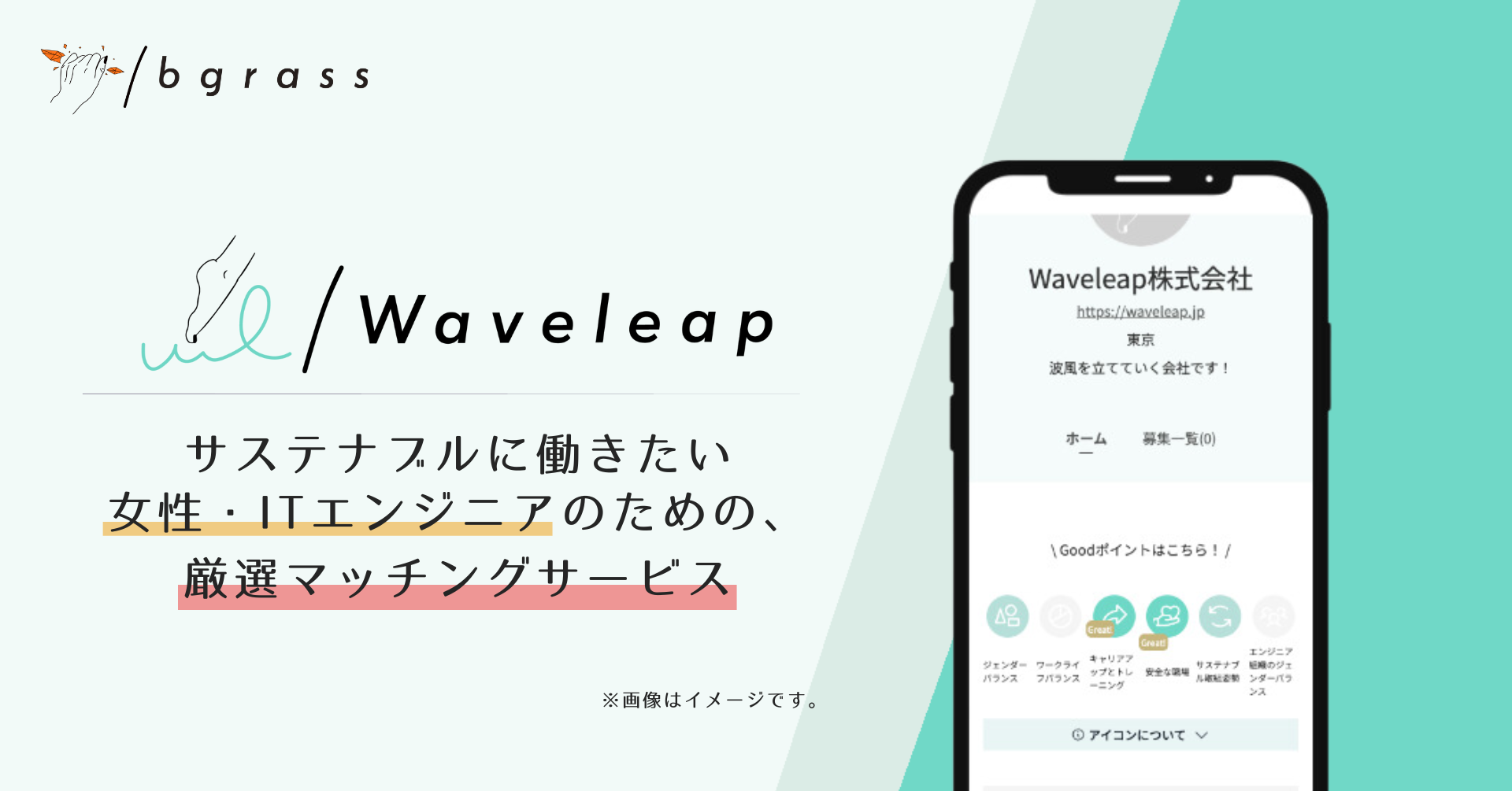「Waveleap」(https://lp.waveleap.jp/)は、技術もライフも諦めず、IT業界で持続的に働いていきたい、ハイスキルを目指す女性・ITエンジニアのための厳選マッチングサービスです。「Waveleap」は、厳選されたサステナブルに働ける企業のみが登録しており、その登録企業の働きやすさ・活躍のしやすさを、独自のサステナブル職場診断で可視化します。また、掲載企業は「Waveleap」を利用を通してジェンダー平等・ダイバーシティ推進の実施が可能となっています。