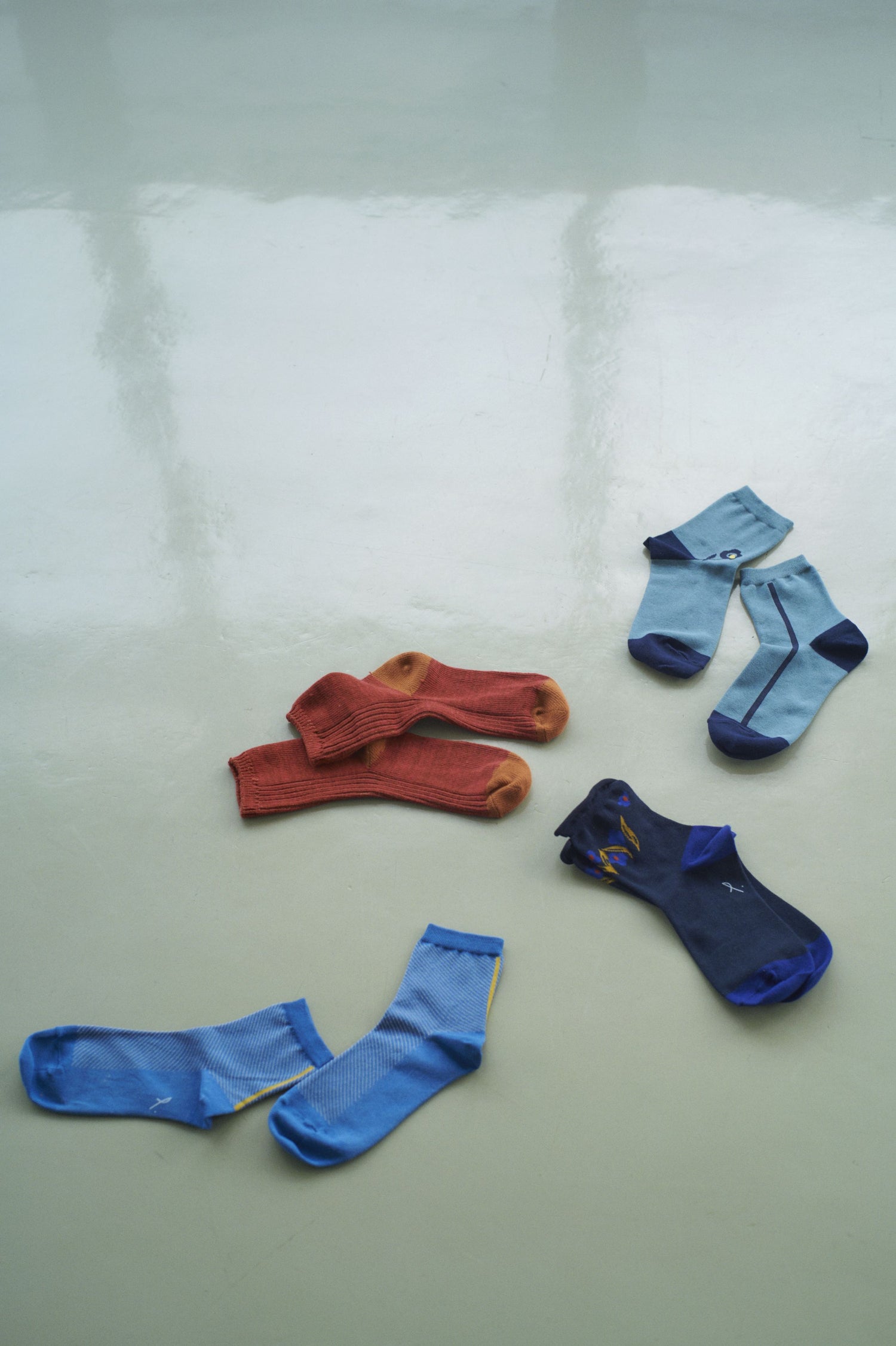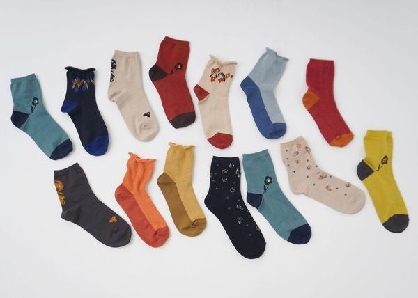 履き口がロールしている靴下、靴をはいたときに花がのぞくデザインにこだわった靴下など、色柄を豊富に取り揃えた。(画像は一部)