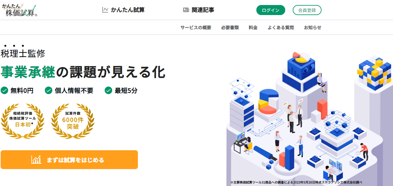 事業承継の支援実績豊富税理士の監修のもと開発された、Web上で株価・相続税を無料試算できる日本初(*)のサービスです。