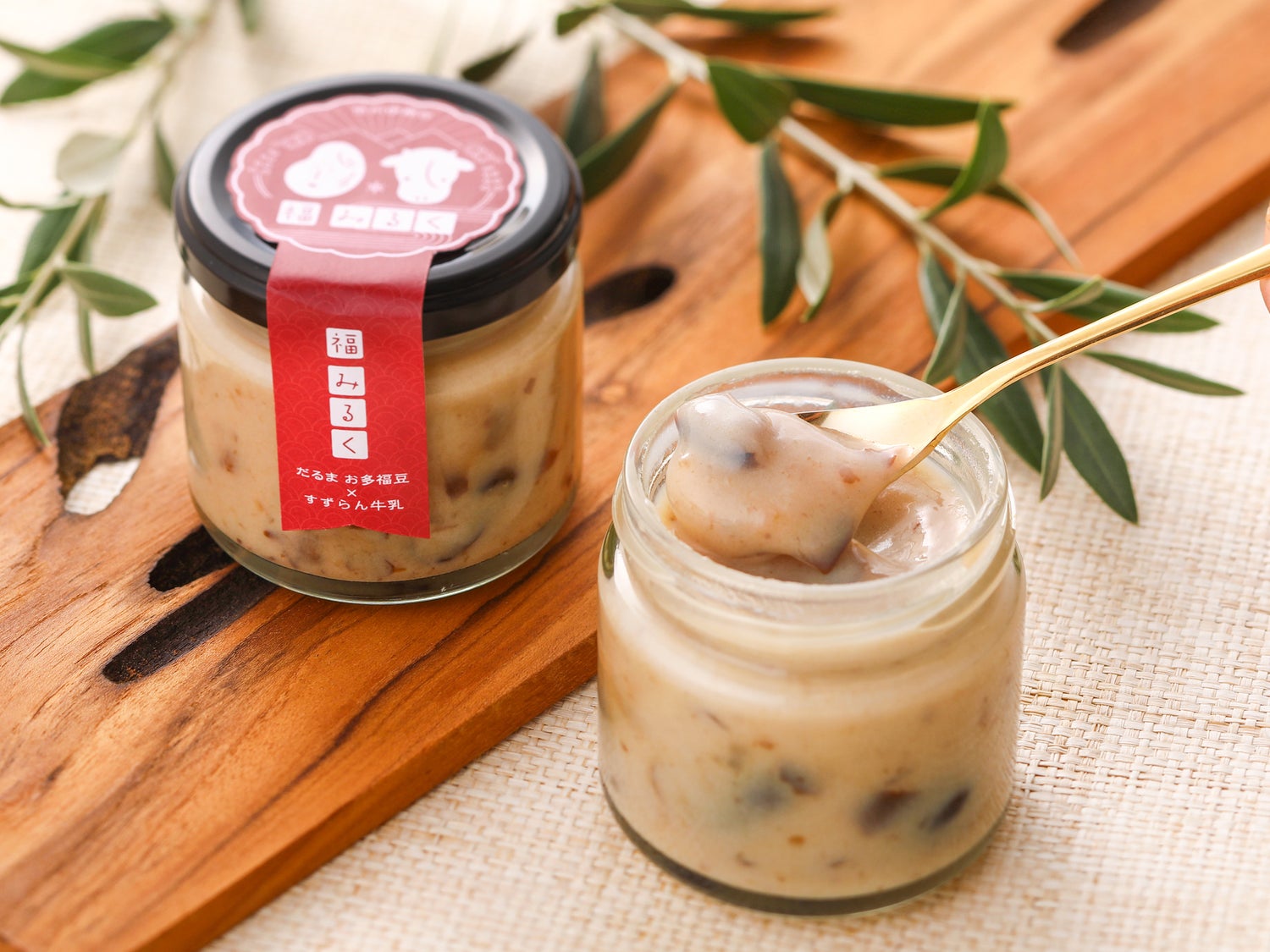 だるまの「おたふく豆」と駒ヶ根高原すずらん牛乳で作られたミルクジャムが出会って生まれた逸品です。おたふく豆は、70年以上にわたり伝統の製法で作られ、その絶妙な甘さと豊かな風味が特徴です。