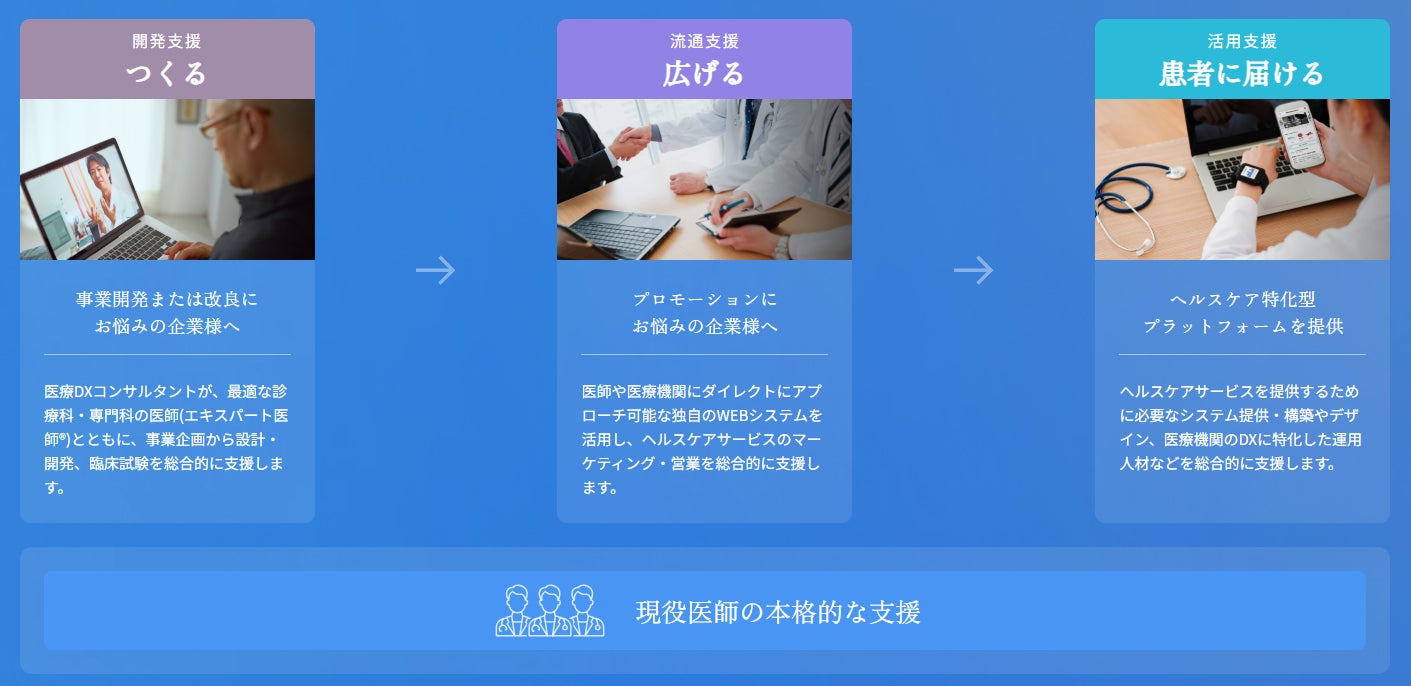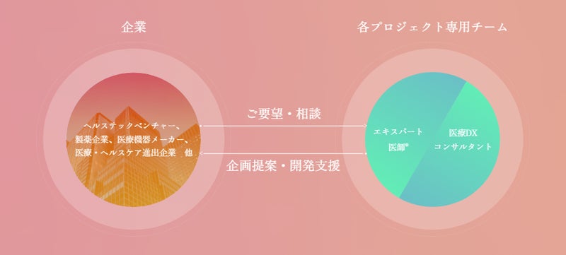 Doctors Hub™は、700名超のエキスパート医師®︎と、医療DXコンサルタントから成るチームが、貴社のデジタルヘルス開発を総合支援するサービスです。医療現場で真に受け入れられるサービスとするために必要なヒアリングやプロトタイピングをベースとした企画・開発支援や、既存のデバイスをクラウド化・サブスク化する事業化支援、病院やクリニックをフィールドにした臨床研究の実施から医療機器認証取得支援、論文・学会発表まであらゆるデジタルヘルス開発のプロセスをサポートします。