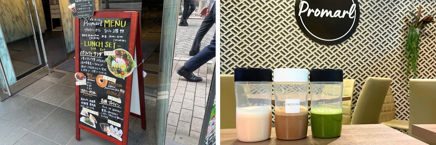 プロテインCafeプロマール(東京都港区、赤坂見附駅前)のテイクアウト限定サブスクリプションサービス『PROTEIN CLUB(プロテインクラブ)』β版。月額2,980円で、約20種類のプロテイン・アミノ酸ドリンクから1日1杯お好きなプロテインの注文が可能です。