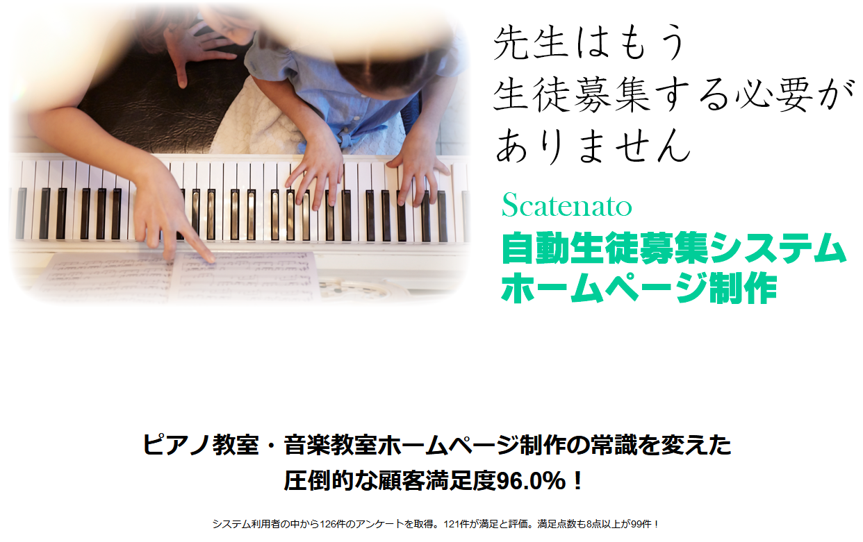 顧客満足度96%を達成し、個人ピアノ教室で生徒数100名を達成する先生を次々と生み出している、生徒募集を自動化するホームページ制作・教室運営コンサルティングサービス。