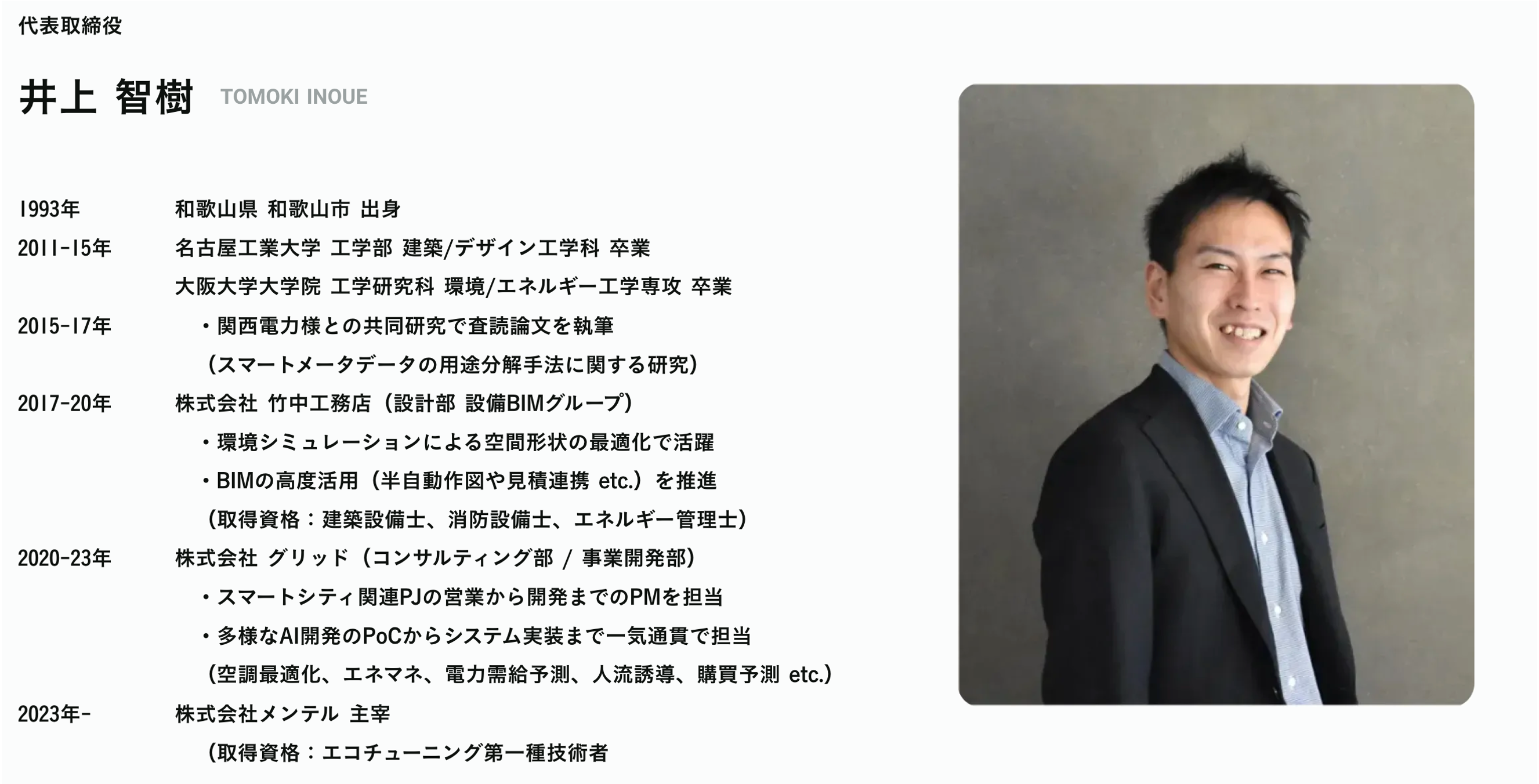 新卒で入社した竹中工務店で建築設備の設計施工を経験し、転職した当時AIベンチャーのGRIDでPM/営業/事業開発を経験。株式会社メンテルを創業し、建築xエネルギーxITのドメイン知識を強みに、建物や都市をサステナブルにする事業を展開。 https://menteru.jp/