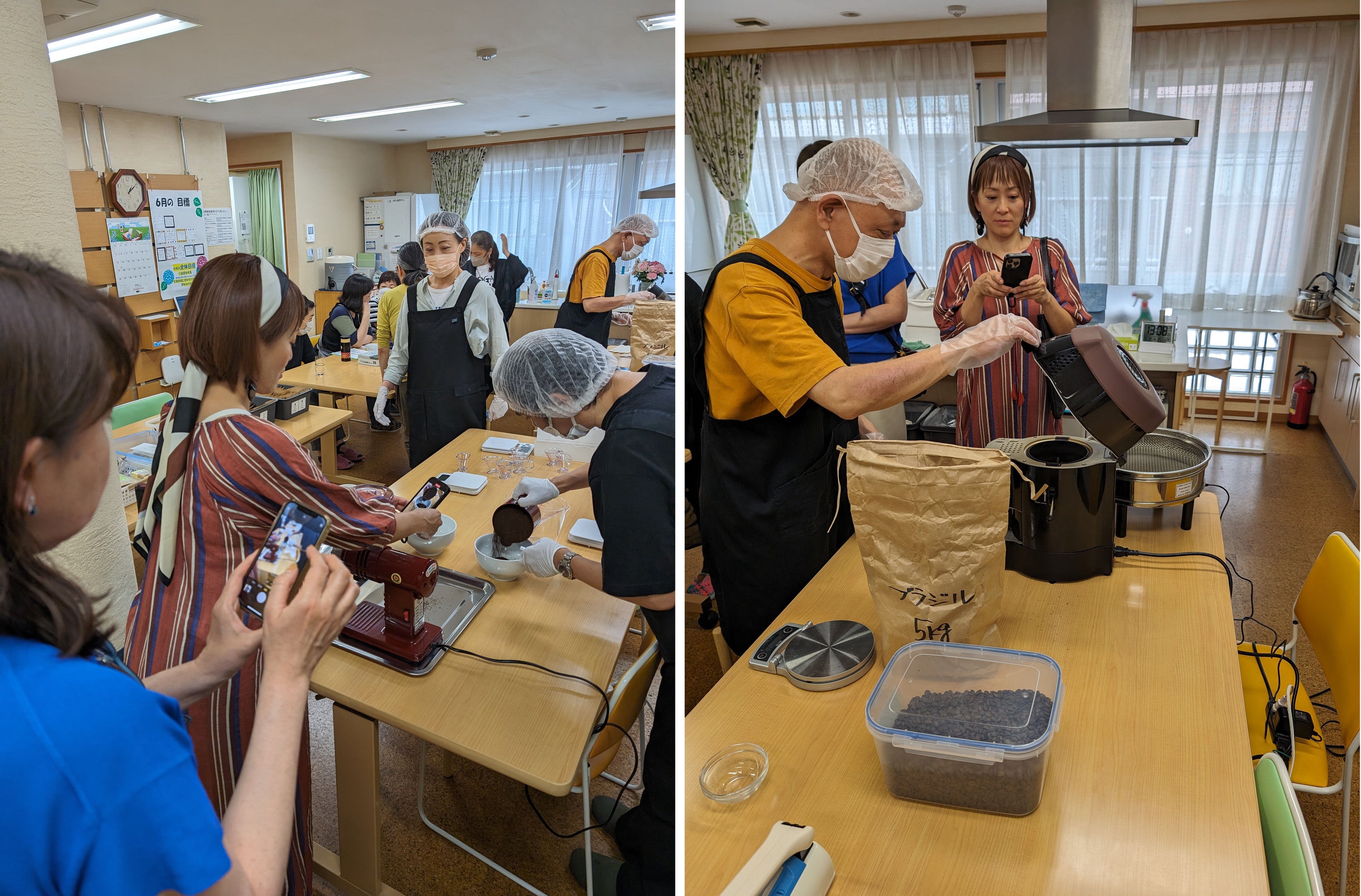 「専門の知識や経験は不要。炊飯器でお米を炊くように、誰でも簡単・失敗なくコーヒー豆の焙煎ができる」を目標に、改良・開発中の小型自動焙煎機のプロトタイプ。焙煎窯の中の温度や攪拌用モーターをプログラムで管理し、遠赤外線ヒーターで豆の中まで均等に熱を加えます。遠赤外線ヒーターが水蒸気を焼き切るので、煙が出ず、排煙施設の設置は不要。1回で約150gのコーヒー豆の焙煎ができます。このプロトタイプを2021年6月から障がい者支援事業所やカフェなどに無償で貸与(2024年10月から有償化)して、コーヒー豆焙煎ビジネス・プラットフォーム「RoCoBeL」の実証実験をしてきました。来年夏までには、改良版の量産新型モデルの発売をしたいと思っています。
