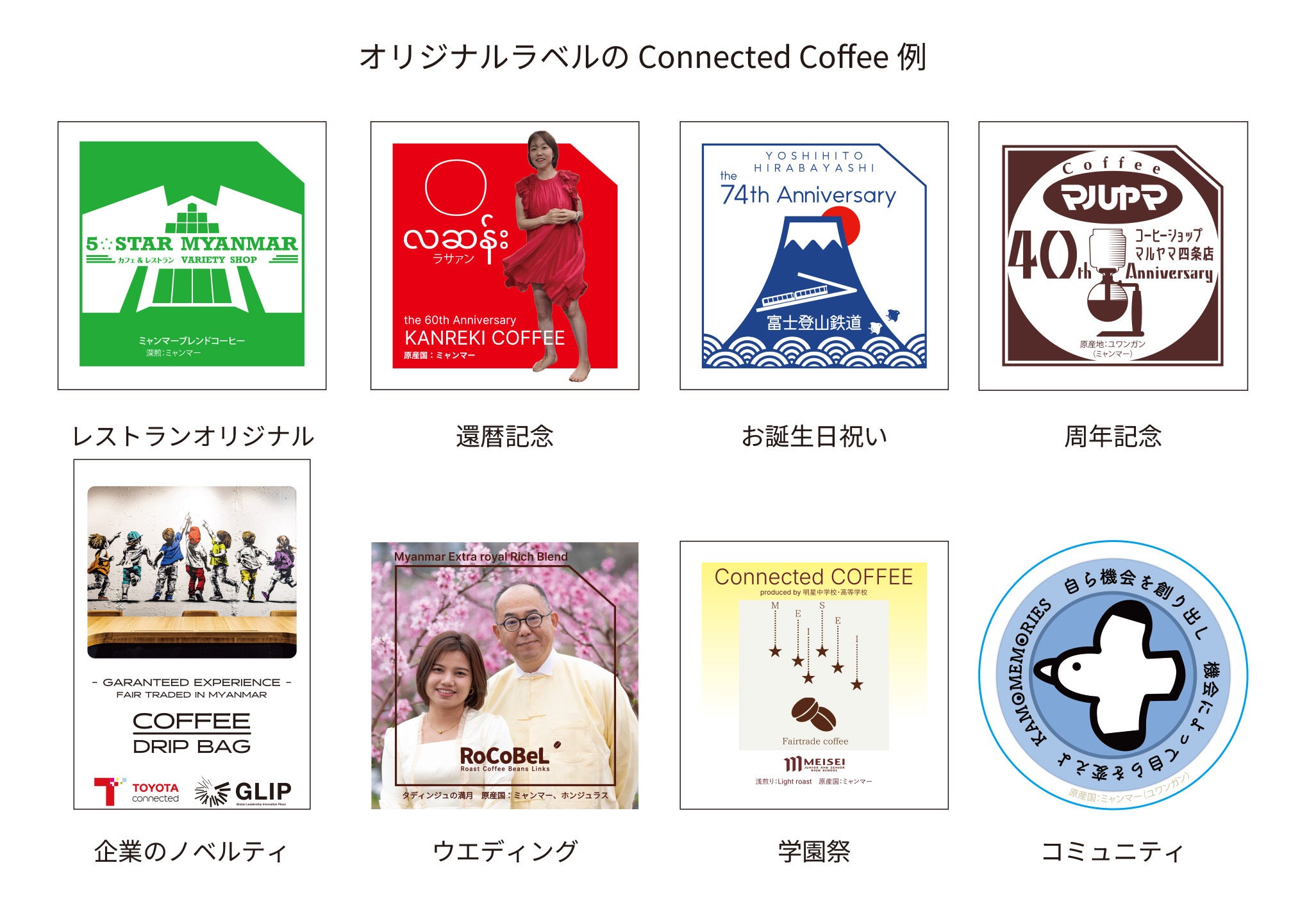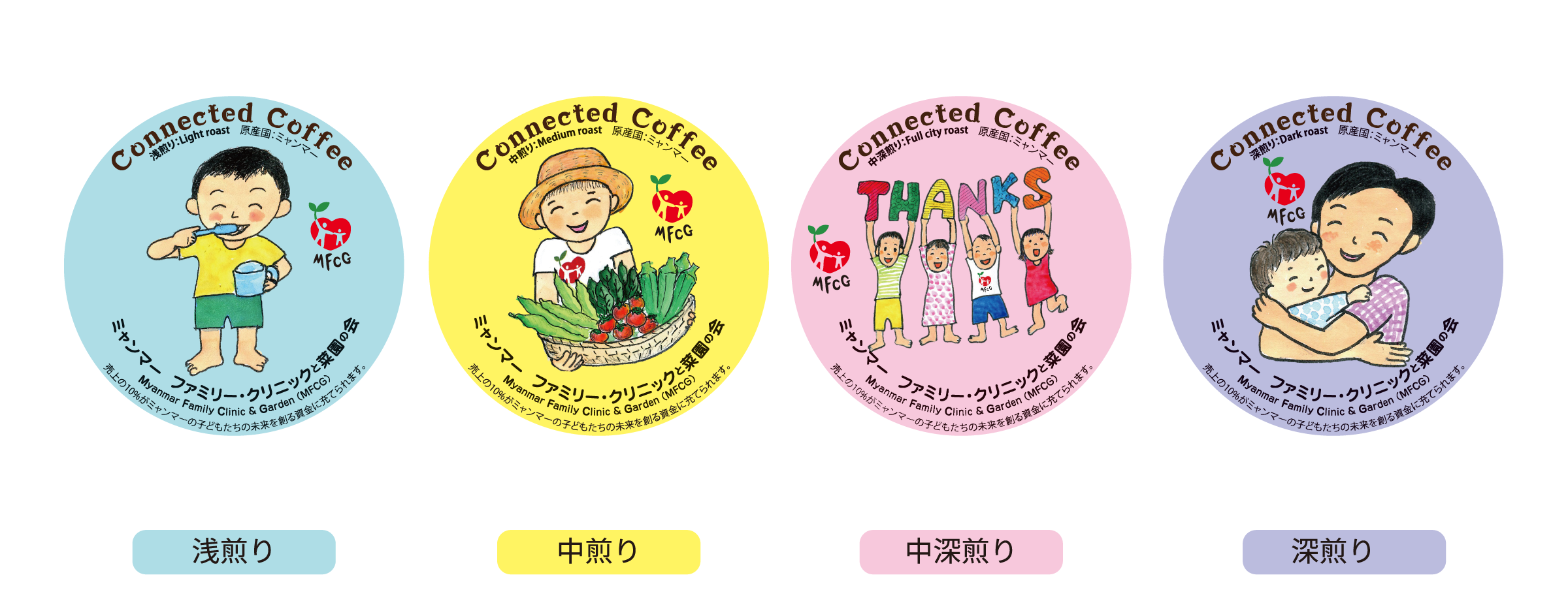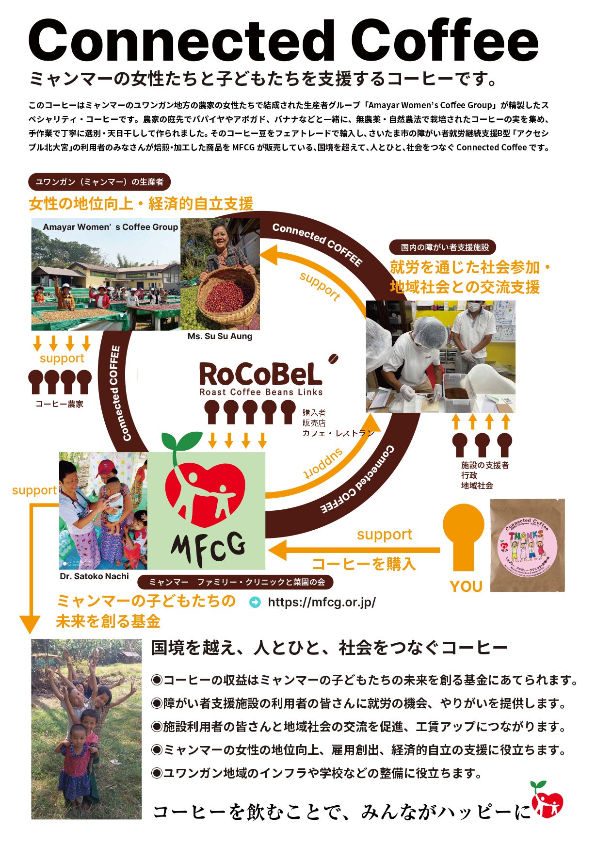 Connected Coffee(つながるコーヒー)の原点となるコーヒー。 ミャンマーの中部高原地帯、標高1,190m~1,805m に広がるユワンガン地方の農家の庭先では、パパイヤやアボガドなどフルーツと一緒に自然農法でコーヒーの樹を栽培。そのコーヒーの実を「女性の地位向上、経済的自立、地域活性化」を目的に地元の農家の女性たちが設立した「Amayar Women's Coffee Group」が集めて、手作業で丁寧に選別し、精製・天日干しをして作られたスペシャリティ・コーヒー豆が原材料です。コーヒー豆を産地から直接、フェアトレードで仕入れ、日本国内の障がい者自立・就業継続支援事業所の利用者のみなさんが焙煎。手作業でドリップバッグに加工しています。このコーヒーはミャンマーの生産者の女性たち、国内で焙煎・加工した障が