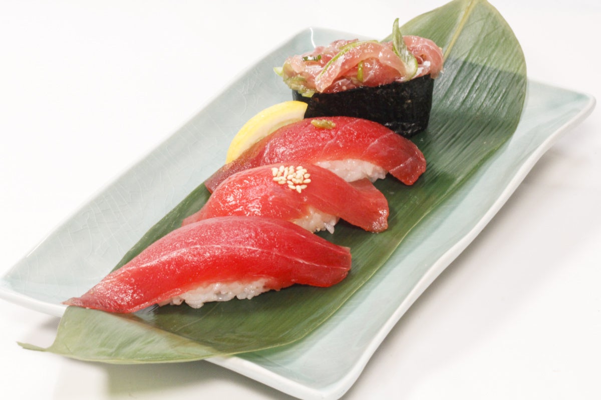 三崎港で水揚げされた新鮮なメバチまぐろを、赤身・醤油漬け・塩漬け・ほほ肉ユッケの軍艦の4種で味わえます