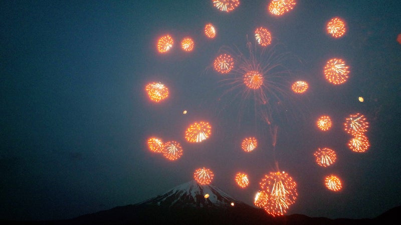 夕映えの残雪の富士山、そして、日本の春を象徴する桜を背景に、創業100年以上の日本の花火業界BIG4(紅屋青木煙火店、磯谷煙火店、齊木煙火本店、菊屋小幡花火店)が各々の伝統と技術の粋を極めた花火を大空に咲かせます。霊峰富士と匠の技が織成す比類なき絶景。美麗な尺玉(10号)の花火やスターマイン(連発花火)など多彩な花火が富士山を彩ります。