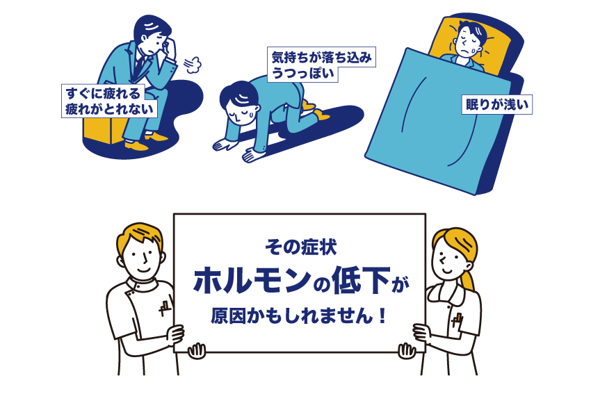 すぐに疲れる・疲れが取れない、気持ちが落ち込みうつっぽい、眠りが浅いなどの症状はホルモンの低下が原因かもしれません。気になる症状がありましたら早めの検査をおすすめします。