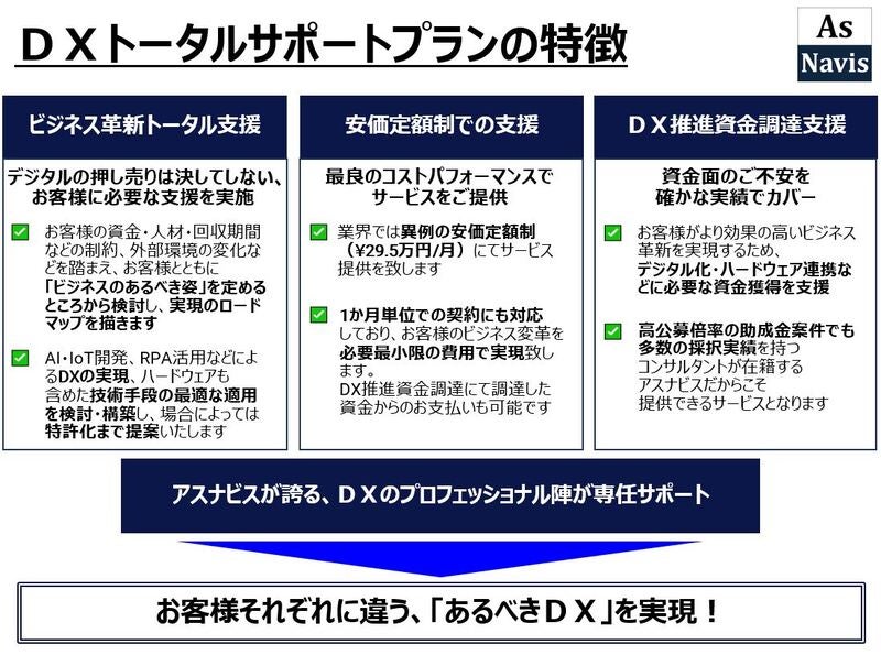 「DXトータル支援サービス」は中堅・中小企業様が着実な成果を出すデジタル・トランスフォーメーション(DX)推進に取り組んで頂くためにリリースしたサービスとなります。