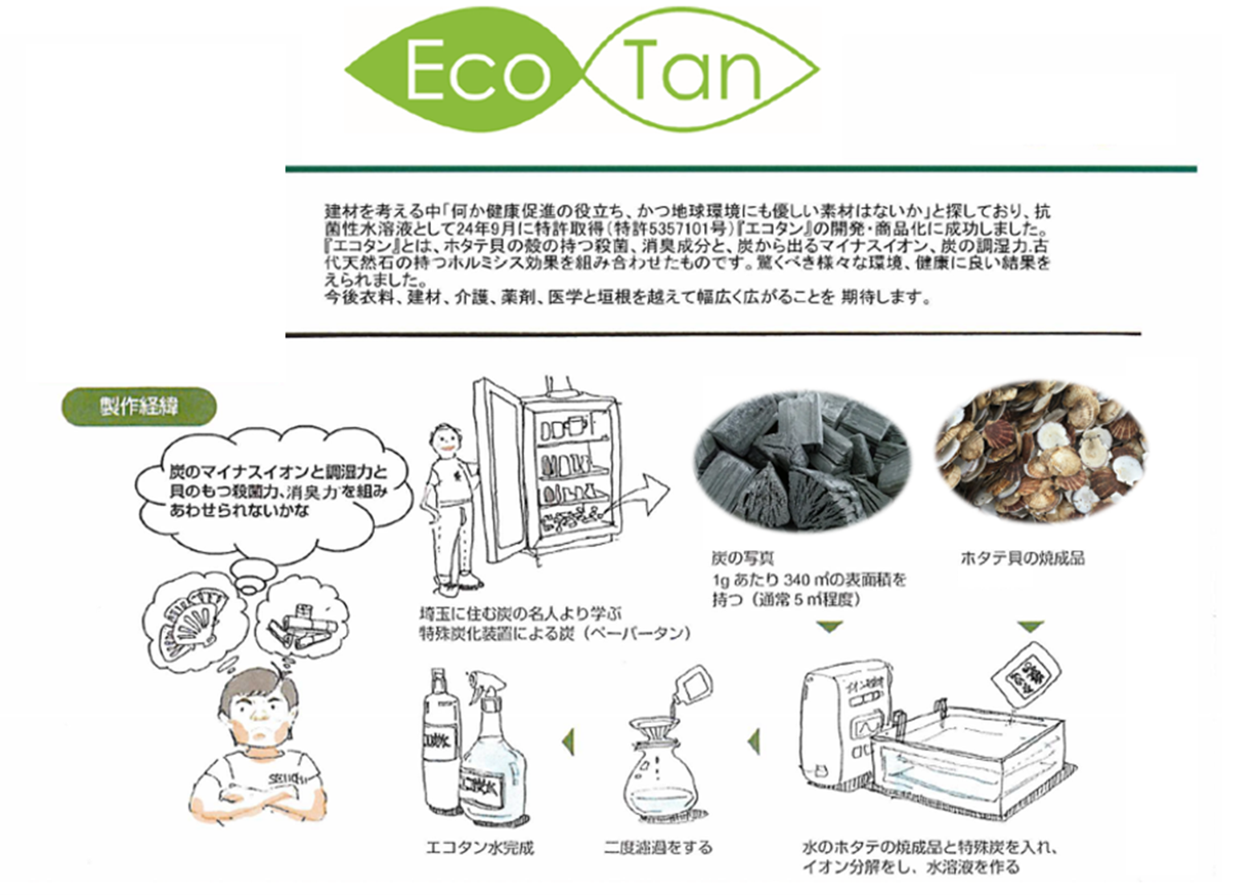 またホタテ貝と炭から生まれた消臭・抗菌作用をもつエコタンテクノロジー(特許5357101号)を開発し、エコタン塗料を使用した建築はまさに地球や人に優しい建築物です。これからは建築業界だけに留まらず、皆さんの健康により役に立つものを開発・発信して参ります。