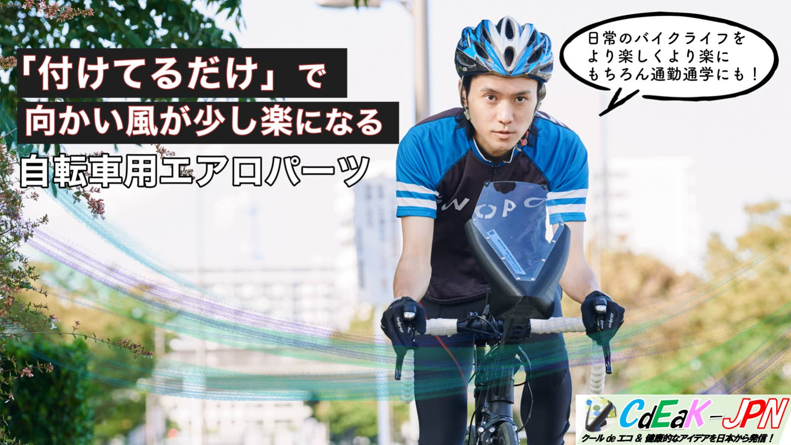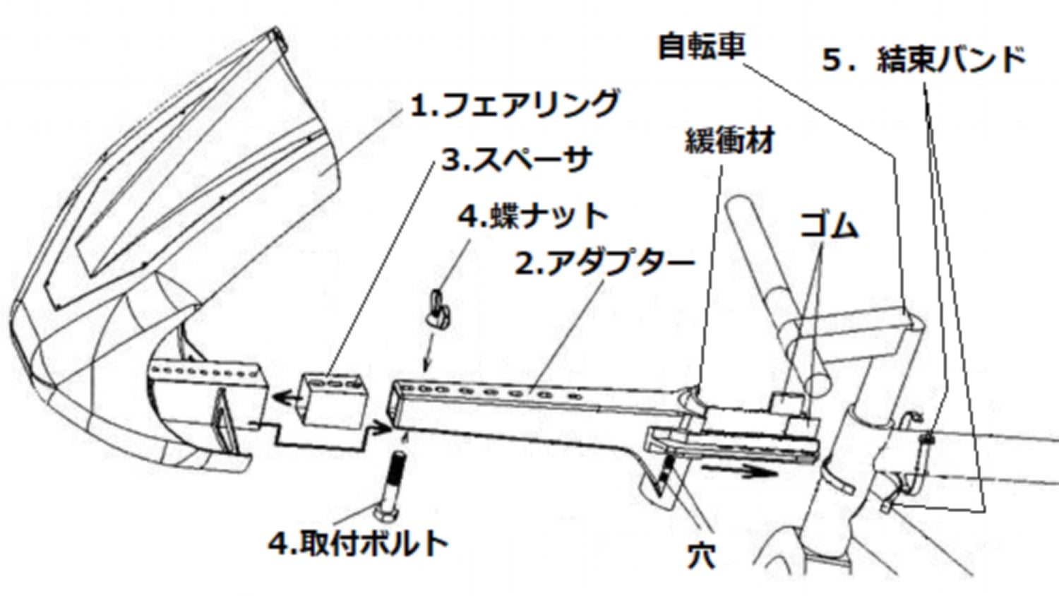 自転車を秒速3mの向かい風の中、時速20kmで走行した場合、パワーロスの約90%は空気抵抗によるものです。この空気抵抗を軽減すると、より快適にサイクリングを楽しんだり、向かい風の中で自転車の通勤通学が少し楽になります。また、電動アシスト自転車でもパワーを削減することで航続距離が延びるメリットがあります。 この器具を装着することで、自転車特有の課題を解決し、みなさんに新しい自転車の楽しさを提供します。