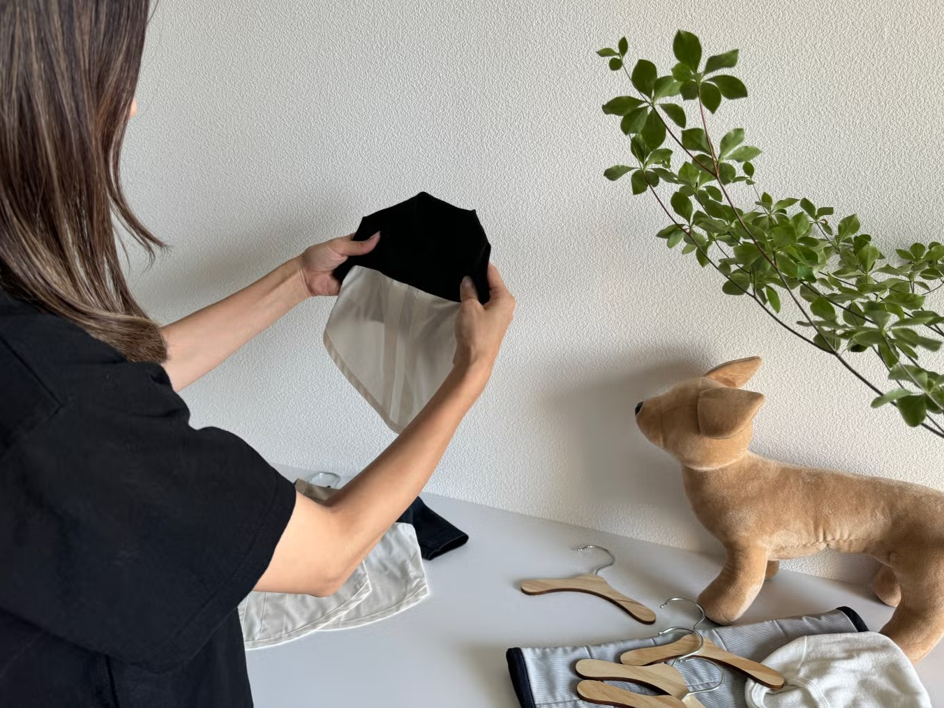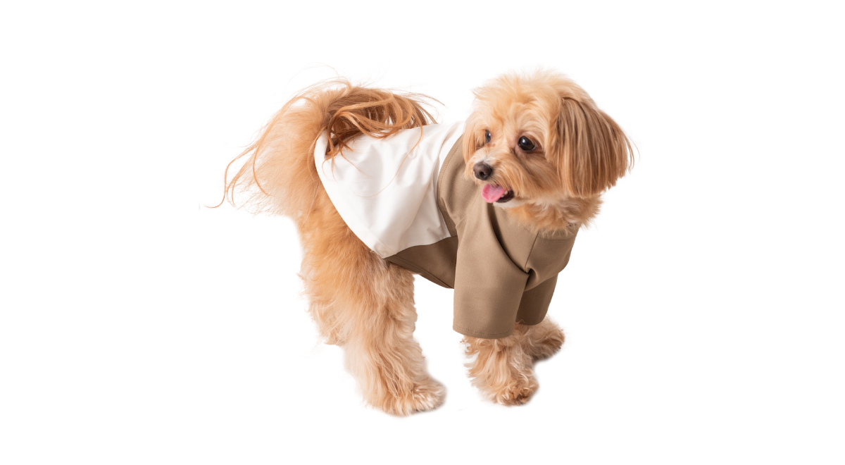 ブラウスのような白の生地は、リサイクルポリエステル(※1)を使用。やさしい肌触りで、愛犬の体をふんわり包みます。しっとりなめらかで、シワになりにくいのもうれしいポイント。