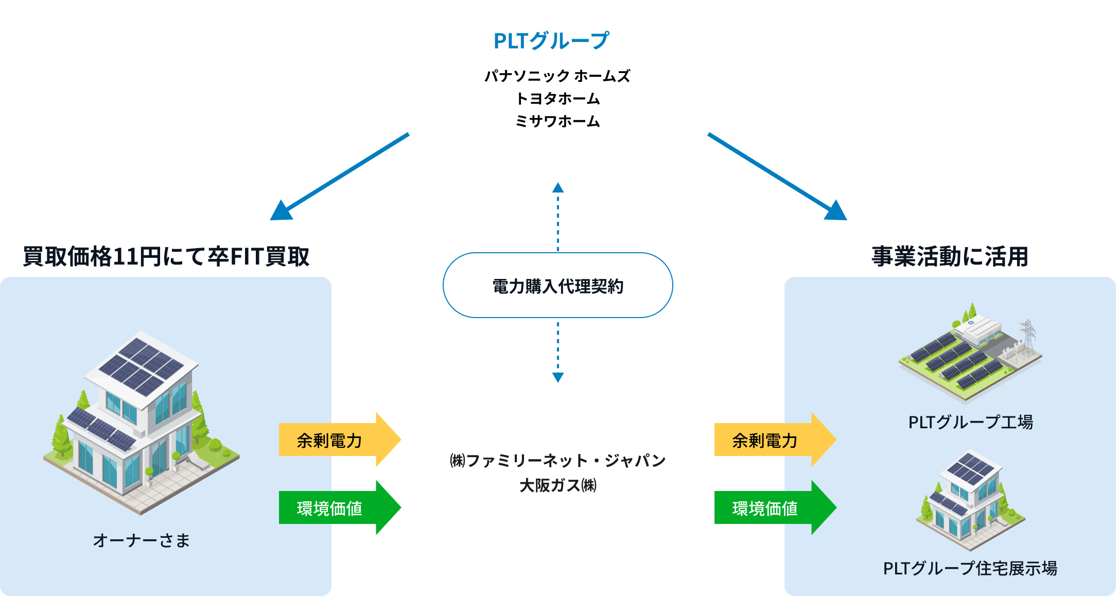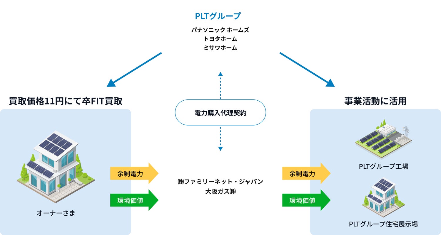 『PLTでんき』は、プライム ライフ テクノロジーズグループ住宅会社3社(パナソニック ホームズ、トヨタホーム、ミサワホーム)の住宅オーナー様およびリフォーム工事の契約者様を対象とした太陽光発電システムの余剰電力買取サービスです。『PLTでんき』の受付を2024年3月より順次、開始しています。