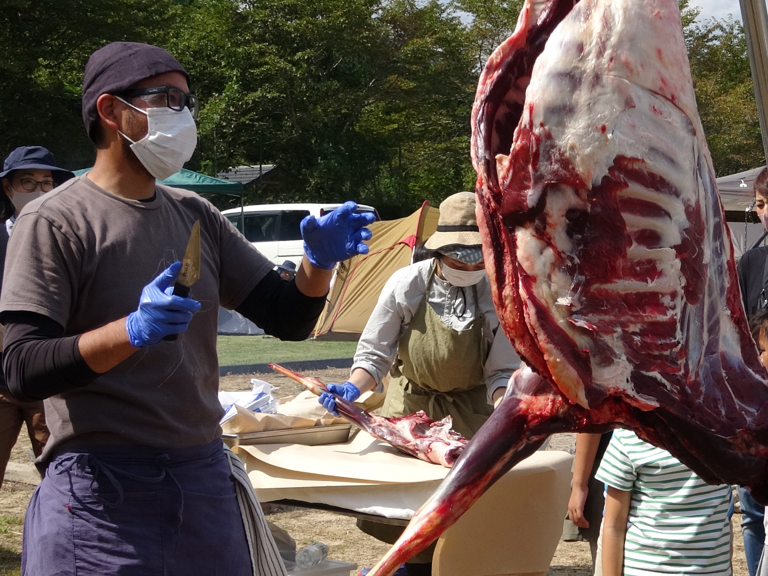 ミドリカフェが展開する「森づくり事業」のコンテンツの一つ。丹波篠山市のやまもりサーキット(キャンプ場)と業務提携し、「森の学び×キャンプ」を掛け合わせた事業。“草むらの學校”プログラムでは、実際にその地域に暮らす自然や生き物などに詳しい住民の方々を講師に招き、一緒に草むらに入って昆虫採集をしたり、猟師さんによる鹿の解体ショーをしたり、野草を探して食べたり工作したり、竹を切ってバウムクーヘンを作ったりしている。
