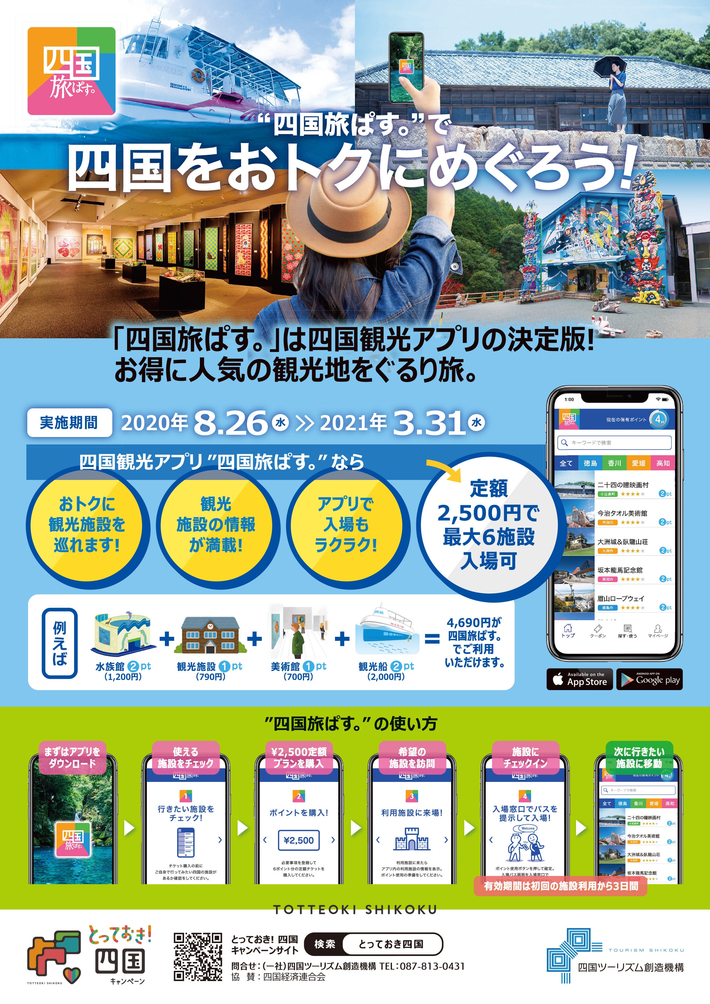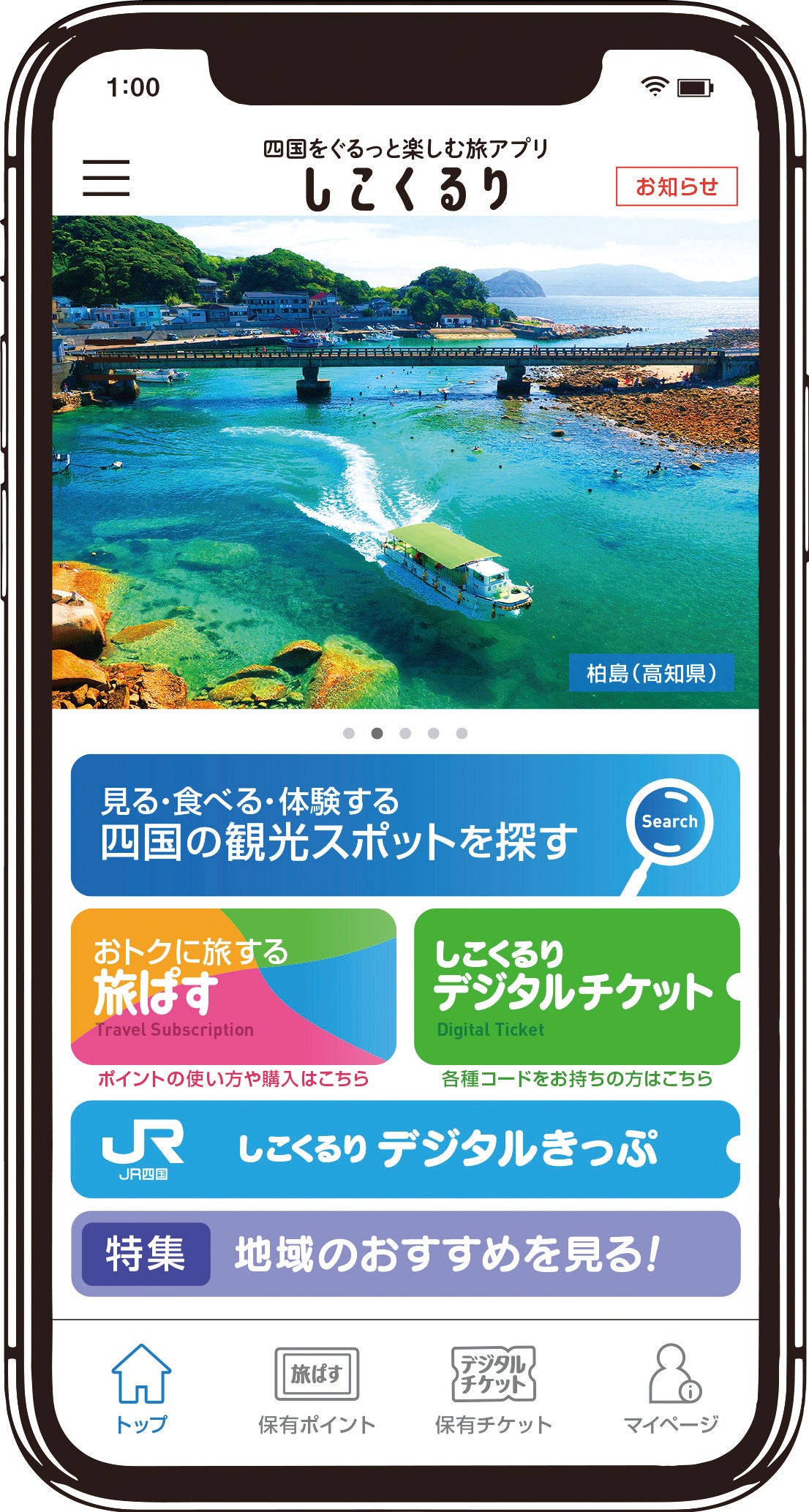 5つの機能により四国の観光・レジャーでおトクに便利に使えるアプリです。5つの機能とは、①四国内の観光スポットや体験・レジャーなど700か所以上の情報紹介機能、②「しこくるり」専用ポイント”旅ぱす”を使って、観光施設や飲食店、お土産店、日帰り入浴施設など、200か所以上でおトクに利用できる機能 ※「旅ぱす」ポイントは2,500円で6ポイントを取得できます。(アプリ内でクレジット決済購入)、③交通機関の乗船・乗車やイベント等のチケットが事前に購入できる「デジタルチケット」機能、④JR四国の特別乗車券が購入できる「デジタルきっぷ」機能、⑤特定地域のコンテンツをまとめた「地域のおすすめ」機能です。