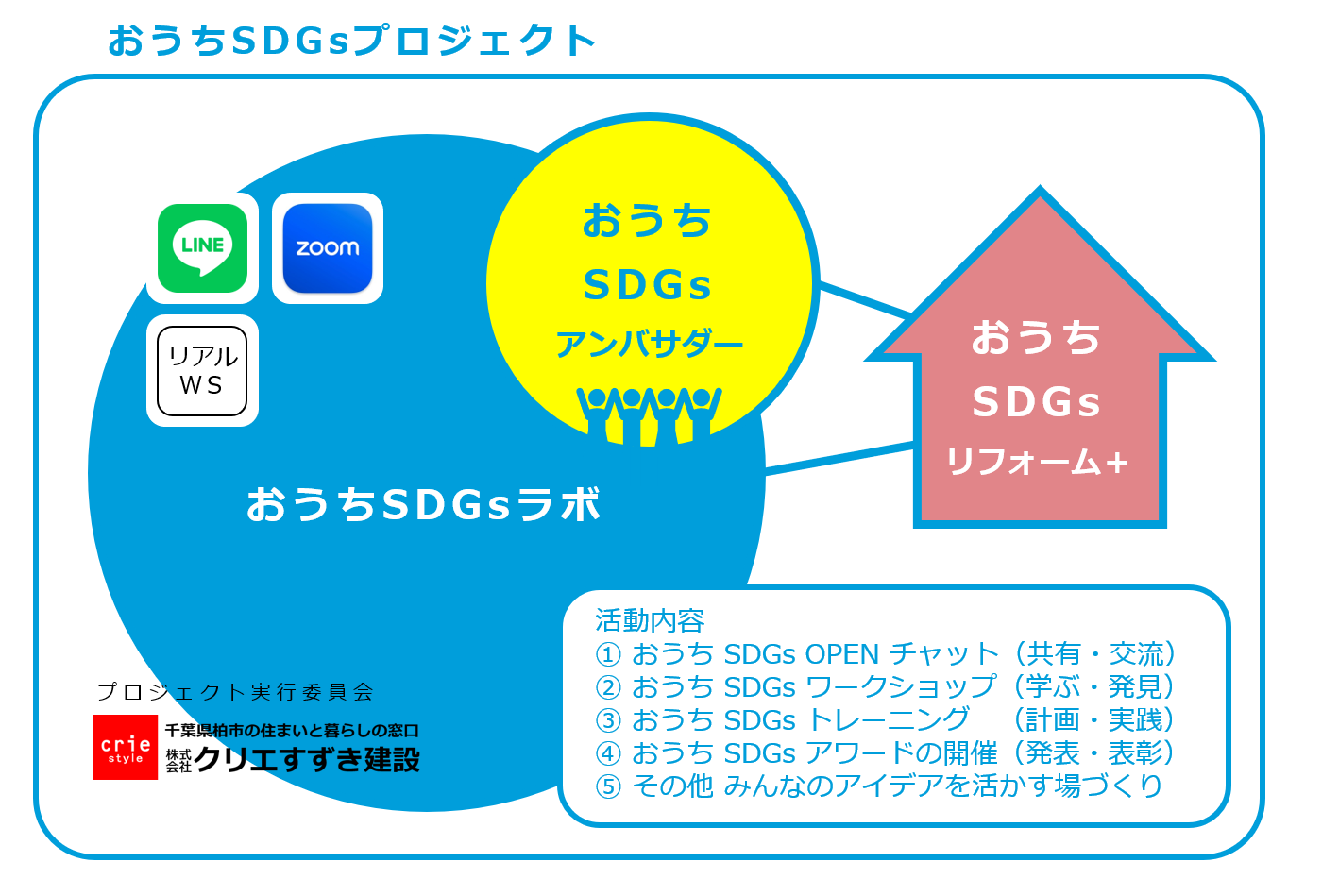 お客さまと、株式会社クリエすずき建設に携わる職人さん、スタッフみんなで一緒に、「心」と「身体」と「経済性」が豊かになる住まいの創造、思いやりあふれる社会づくりのため、建築会社の枠を超えたコミュニティづくりと、地域への貢献を目指している。