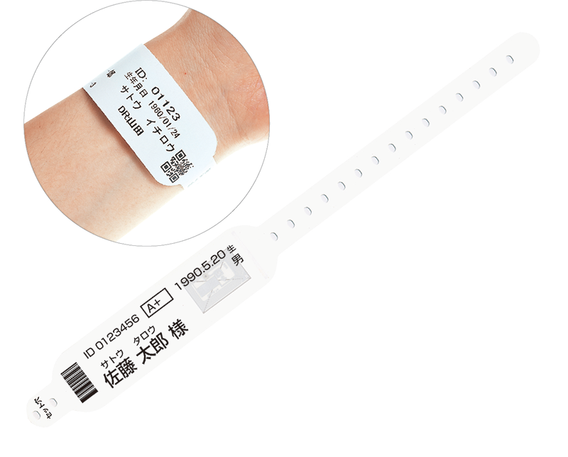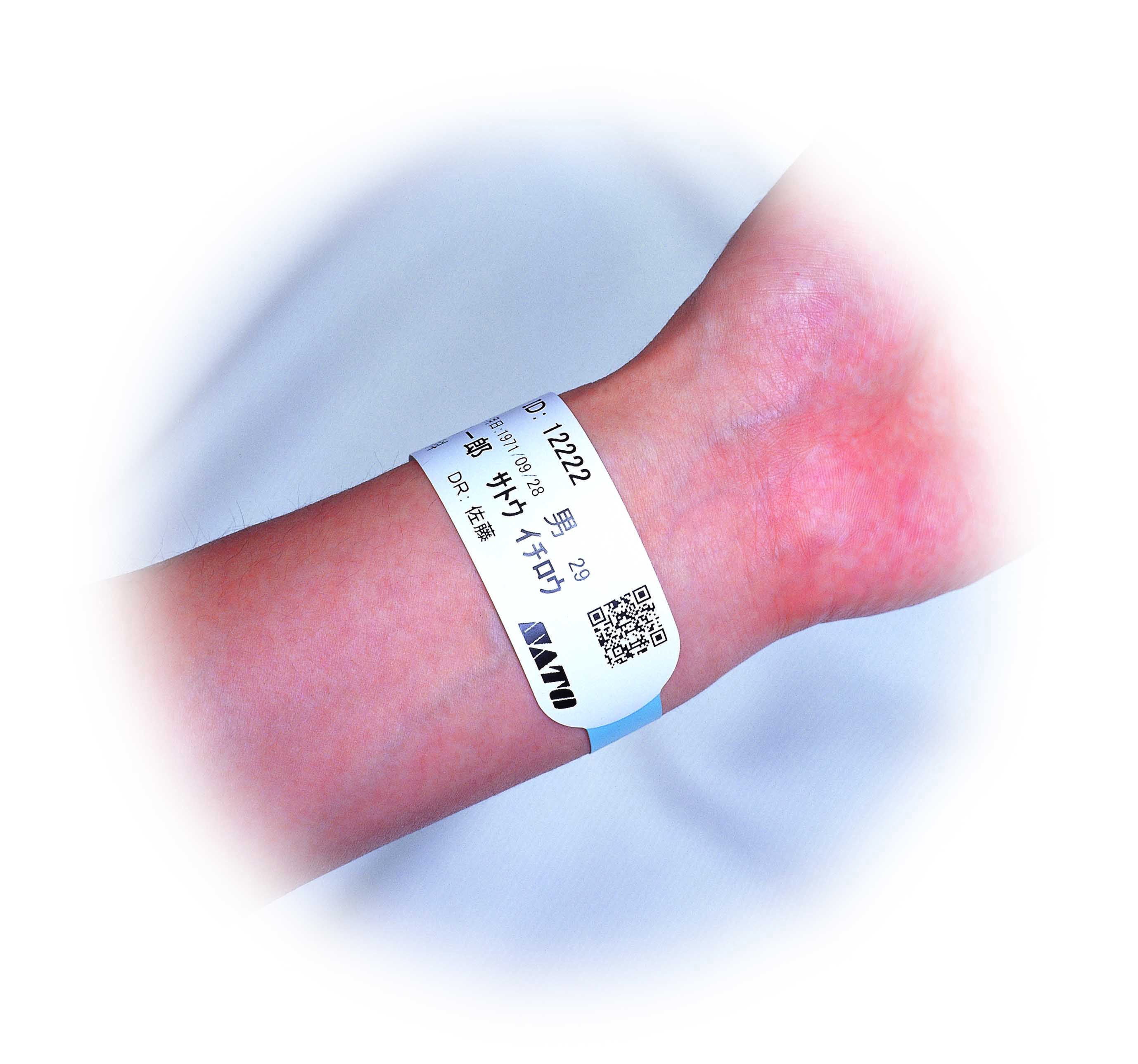 患者の氏名や生年月日、性別、患者IDのバーコードなど、さまざまな情報を印字し、患者の手首に装着するバンドです。患者への薬に投与時には、リストバンドのバーコード、薬のバーコード、医療スタッフのIDを読み取ることで「いつ・誰が・誰に・何を」の情報を登録したり、間違った薬を投与していないか確認する運用が、病院では定着しています。