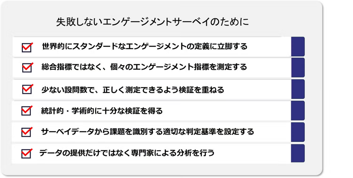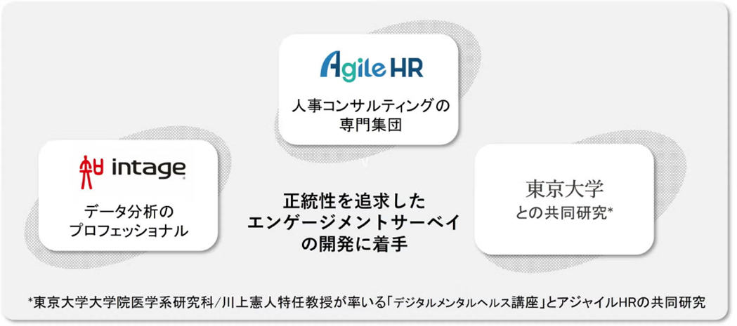 人事コンサルティングの株式会社アジャイルHRと、データテクノロジーの株式会社インテージが共同開発し、東京大学大学院医学系研究科の川上憲人特任教授による社会連携講座「デジタルメンタルヘルス講座」における共同研究を実施した最新のエンゲージメントサーベイ。統計的・学術的な裏付けのあるデータを用い、従業員エンゲージメントを科学的に測定すると同時に、エンゲージメントに影響を及ぼす要因までを測ることが可能。またサーベイ実施後の結果分析を人事とデータ分析のプロフェッショナルである両社が行うことも特徴。