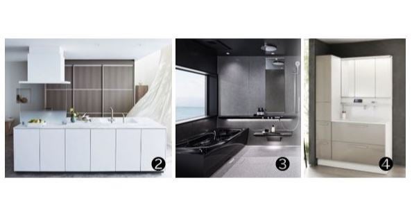 「きれい除菌水」搭載商品 ❷システムキッチン「ザ・クラッソ」❸システムバスルーム「シンラ」❹洗面化粧台「オクターブ」