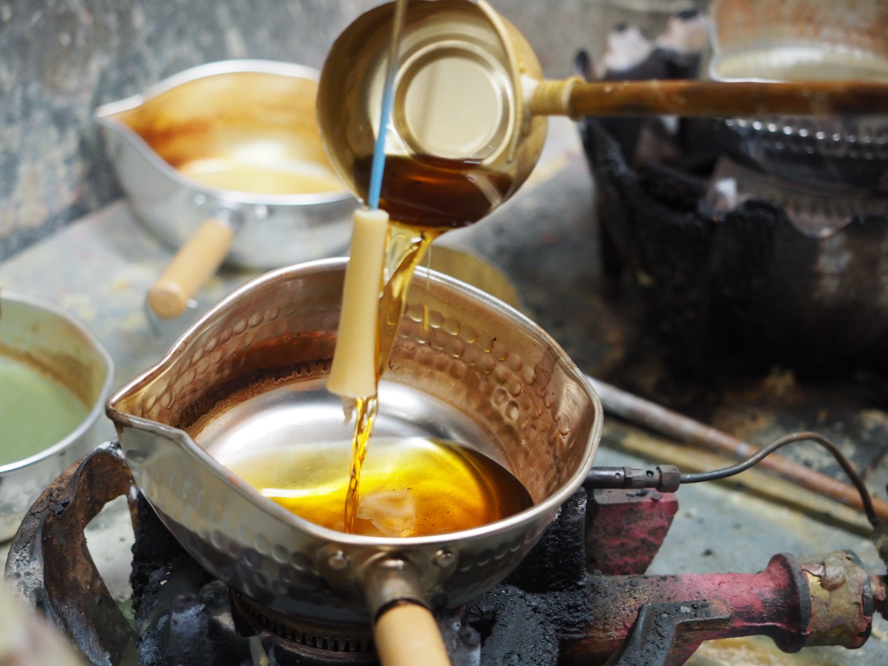 パラフィンなど石油系原料を使うろうそくが多い中、古くから和ろうそくの原材料として使われてきたハゼろうなど、植物性100%の原料だけで作っています。