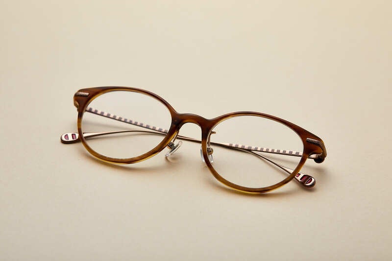 女性向けにデザインされた、少し小さめの丸みを帯びたコンビネーションフレームはマイキーをモチーフにしたもの。マイキーの象徴でもある縞模様をテンプル(つる)の柄やつるの先端に表現しました。リズムある縞模様がアクセントになっています。