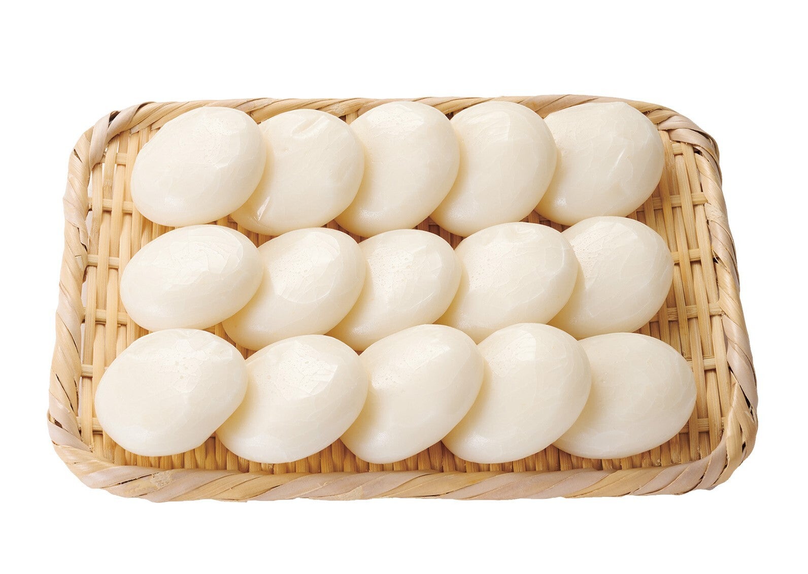 本品は、コシが強くキメが細かい、なめらかな食感が特徴の山形県産のもち米「でわのもち」のみを使用しています。「でわのもち」は、栽培の難しさから山形県庄内地域以外では作付けが少なく、市場流通が少ない希少な品種です。本品は蒸したもち米を杵と臼でつく伝統製法で、なめらかでよく伸びコシのある食感を実現しました。1個あたり約34g、直径5cmの平たい丸もちが1袋に約15個入っています。