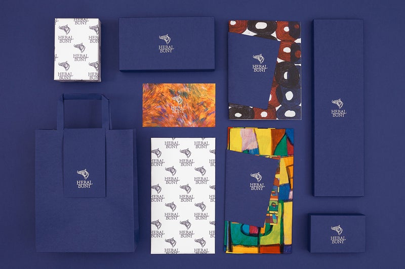 竹尾の紙《ビオトープGA-FS マゼランブルー》を「ブランドペーパー」と定め、ブランドブック、ショッパー、パッケージ、包装紙など展開。ブランドの世界観を統一し、一目でヘラルボニーだと分かるブルーが特徴的。