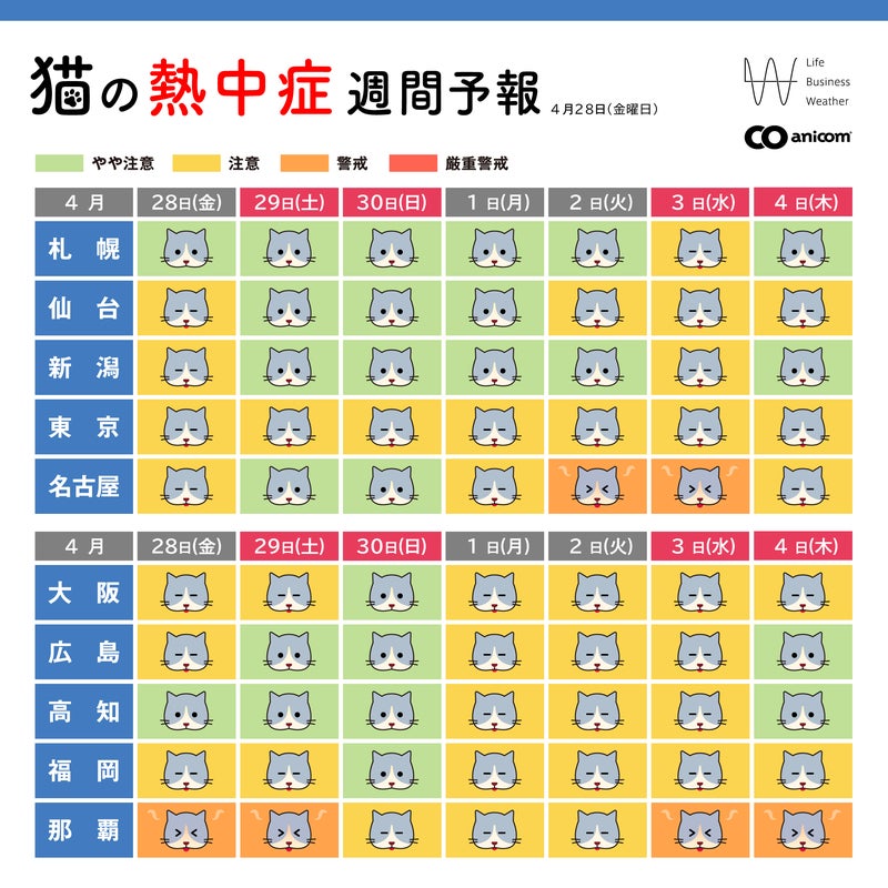 2022年からは「猫の熱中症週間予報」も配信しています。アニコム損保の保険金請求データから猫の熱中症の発生傾向を分析し、犬の熱中症週間予報と同様にリスクを4段階に分けて表示しています。