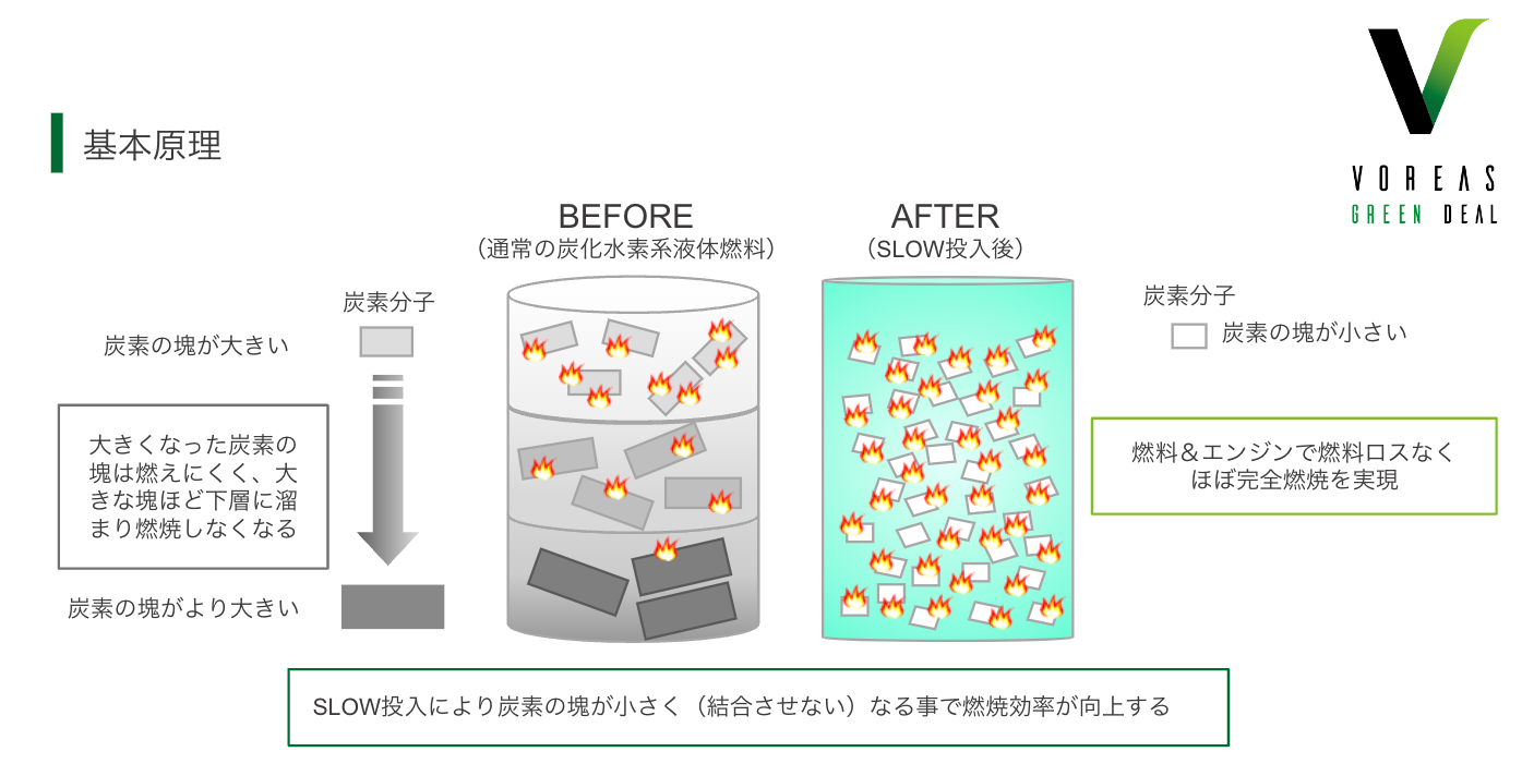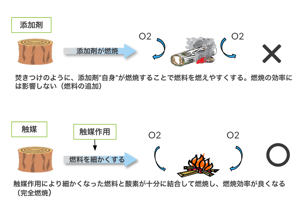 石油由来の燃料(重油、灯油、ガソリンなど)に少量加えることで、燃料内の不飽和分子を飽和分子に変化させ、ボイラー・焼却炉・ヒーター・エンジンなどの内燃機関の燃焼効率を改善させる商品。