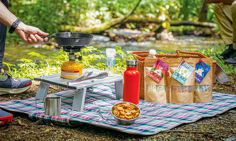 CAMP de OKAKIは、焼き工程前のおかき生地をパックした商品です。アウトドアで焼いて、味付けして、自分だけのおかきづくりと出来立ての美味しさを手軽にお楽しみいただけます。