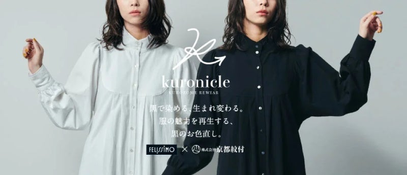 フェリシモ「Live in comfort」が、株式会社京都紋付とのコラボレーションで取り組む「kuronicle[クロニクル]」を2022年12月にスタート。京都紋付が100年培った服の染め替え“黒染め”の技術を用いて、好きだったけれど、汚れてしまってもう着られない服を、捨てずに黒に染め直して、もう一度着る提案をしています。新しい服を販売するにとどまらない、サステナブルな取り組みのひとつです。特設サイトにてサービス受け付けを行っています。
