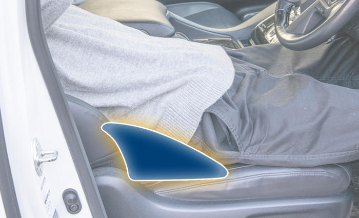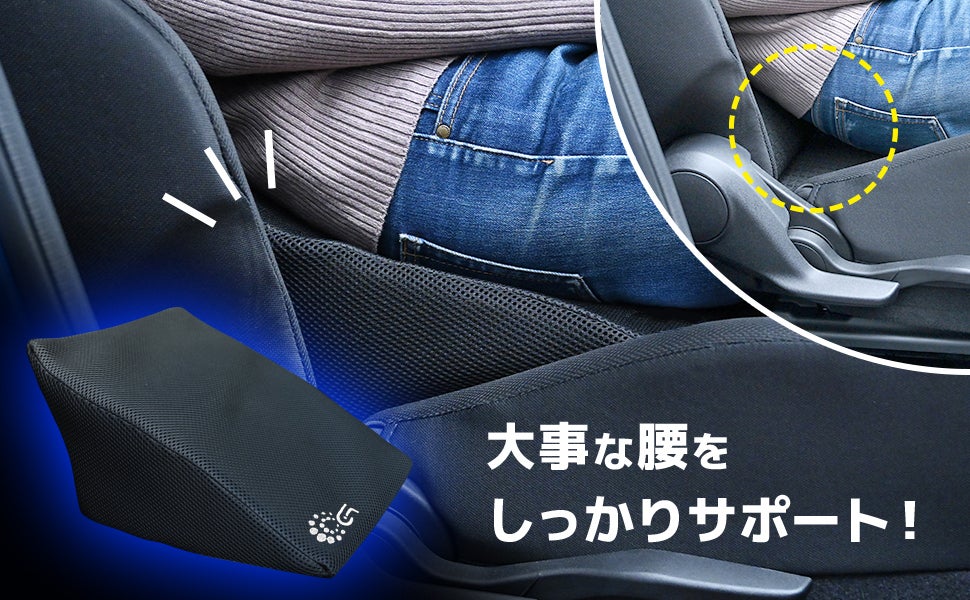 車のシートをリクライニングして倒した時の寝苦しさの原因となる腰下の隙間をピッタリ埋めて簡単にシートをフラットに近づけることで、シート全体で体を面で支えて圧力を分散し宙吊りになっていた腰への負担を軽減するリクライニング専用腰枕です。