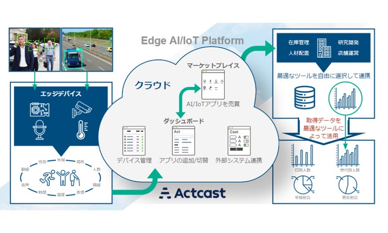 エッジAIプラットフォーム「Actcast」と連携しているため、小売・製造をはじめとするさまざまな領域での省人化/無人化ソリューションとして短手番で導入し、取得データの利活用が開始できます。