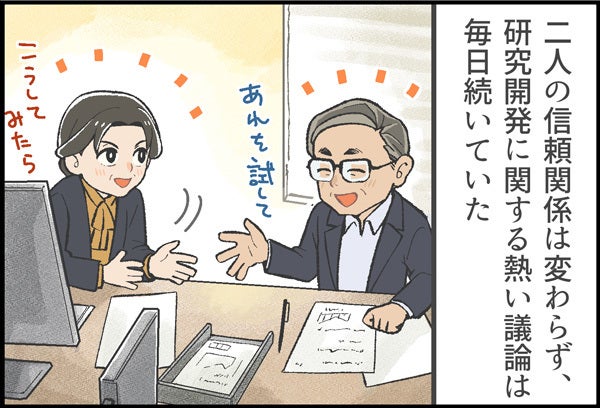 勉強熱心でがんばり屋、研究開発や会社経営の苦難にも昼夜問わず向き合い、乗り越えてきたことで、本人も成長。
