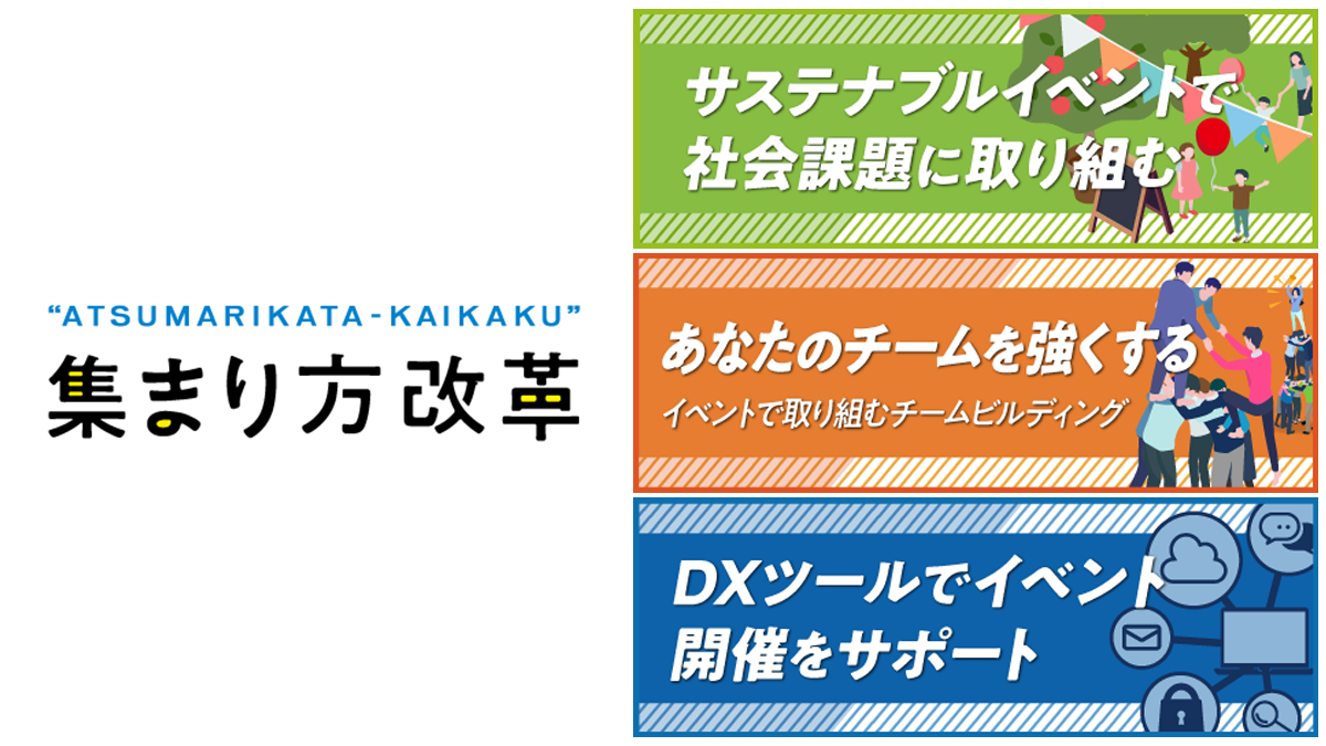 「集まり方改革」は、「サステナブルイベント」「チームビルディング」「イベントDX」に特化したウェブサイトです。