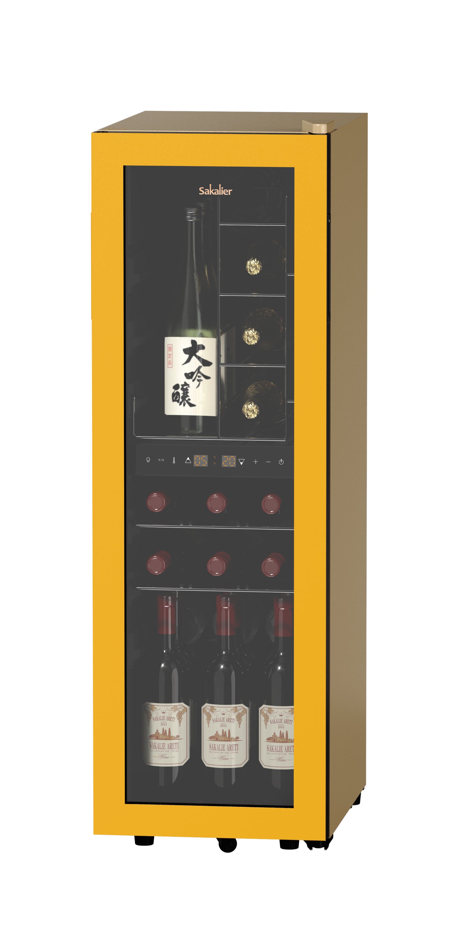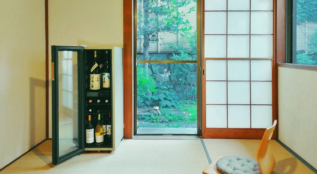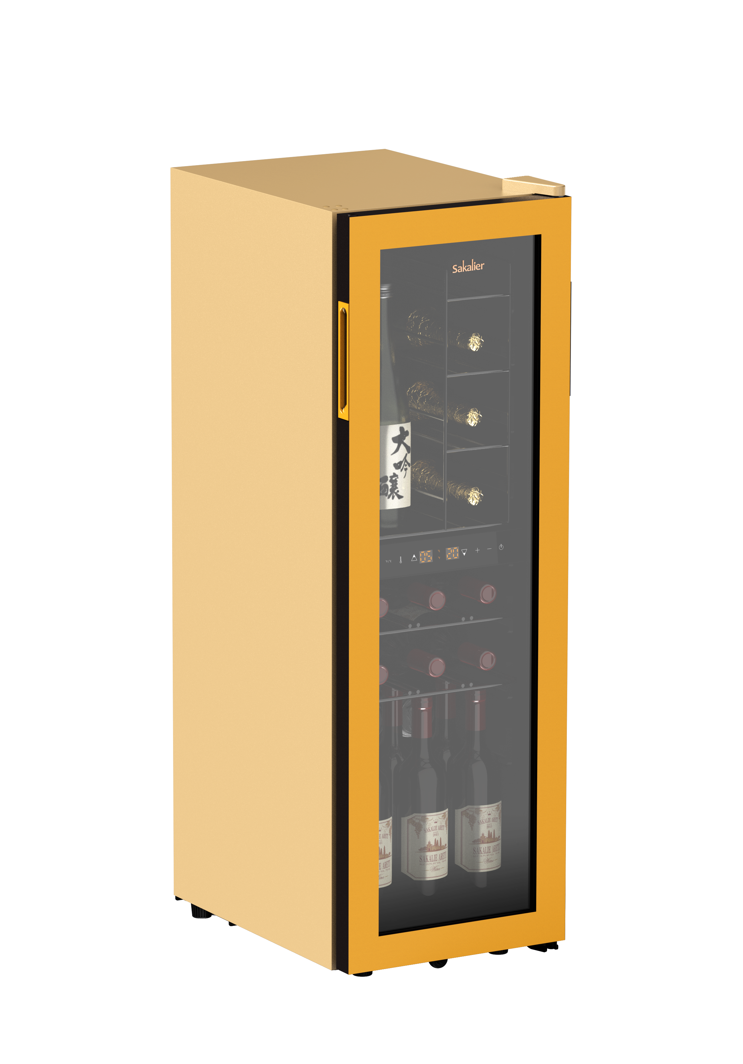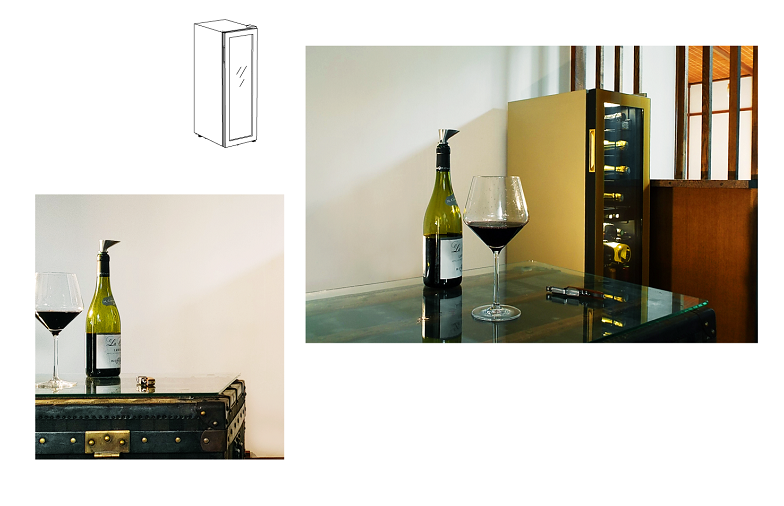 日本の住まいにピッタリ合うように、サイズ、温度管理機能を見直したスリムなワインセラー。料理に合わせて様々なお酒を楽しみたい方のため、シャンパンも日本酒の一升瓶もピッタリ収納可能。無機質なデザインではなく、温かみのあるデザインにもこだわっている。