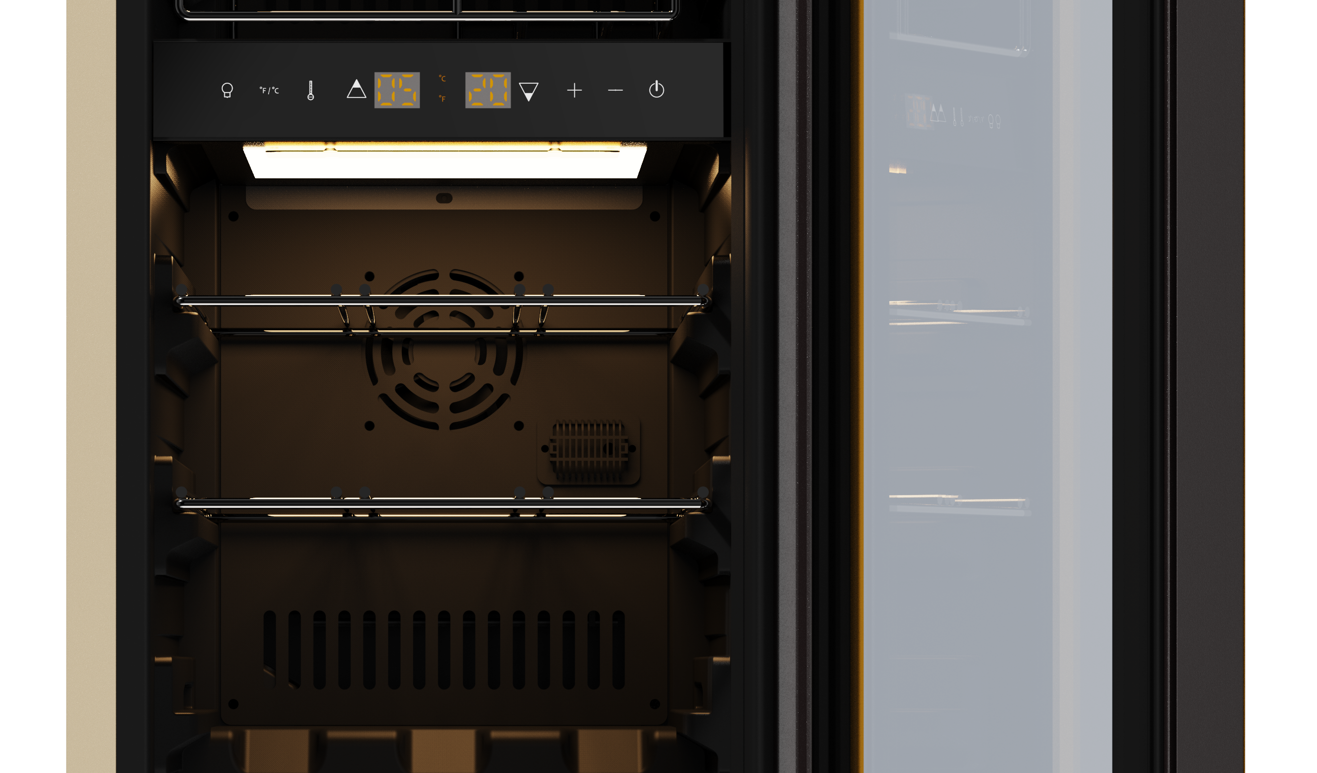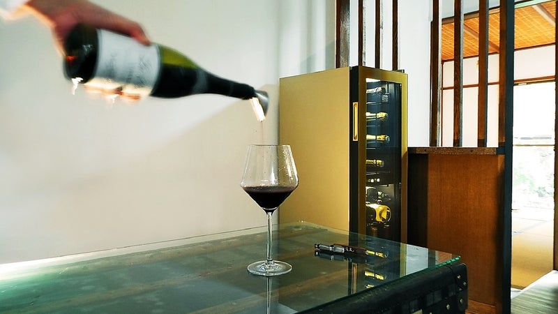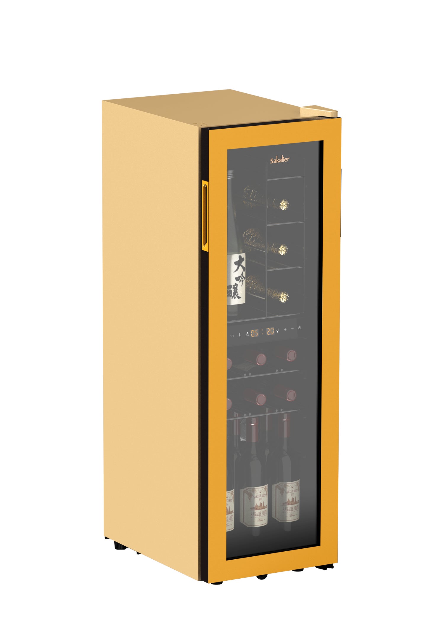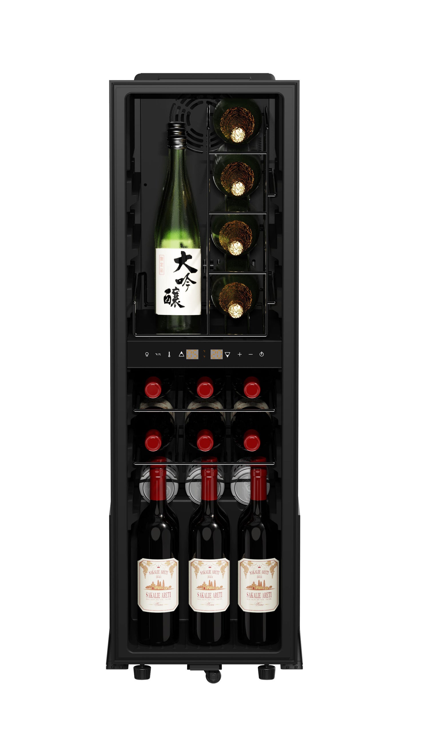 日本の住まいにピッタリ合うように、サイズ、温度管理機能を見直したスリムなワインセラー。料理に合わせて様々なお酒を楽しみたい方のため、シャンパンも日本酒の一升瓶もピッタリ収納可能。無機質なデザインではなく、温かみのあるデザインにもこだわっている。