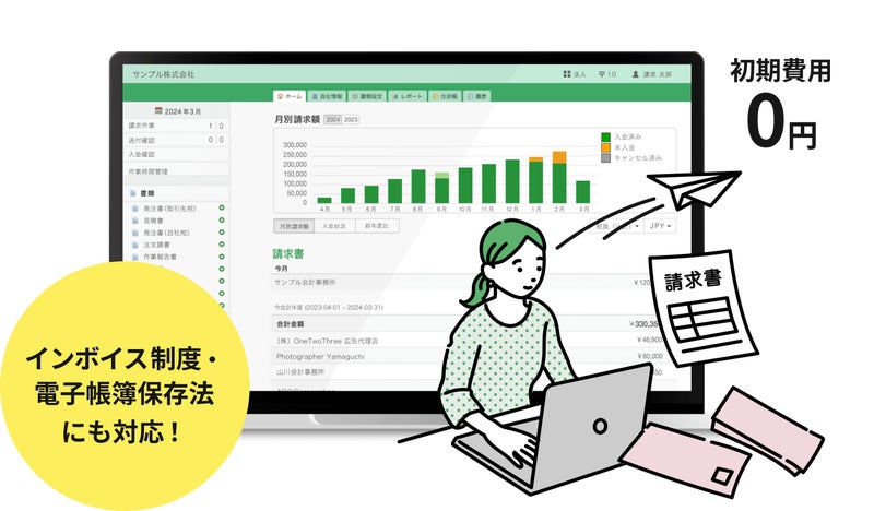 「MakeLeaps」は、クラウド上で簡単に見積書や請求書をはじめとする書類を作成でき、承認、郵送代行や電子送付、入金管理や売上レポートの表示ができる請求管理ソフトです。