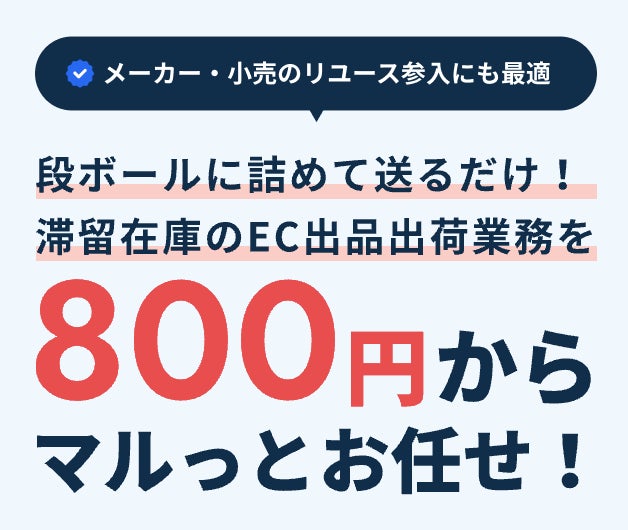 検品・写真撮影・採寸・原稿作成・受注管理・顧客連絡・出荷処理EC出品の面倒な作業を全て代行し、滞留在庫の現金化を強力に支援するサービスです。シンプルで低コストな代行費用で、低〜中単価商品が滞留しやすい問題を解決。